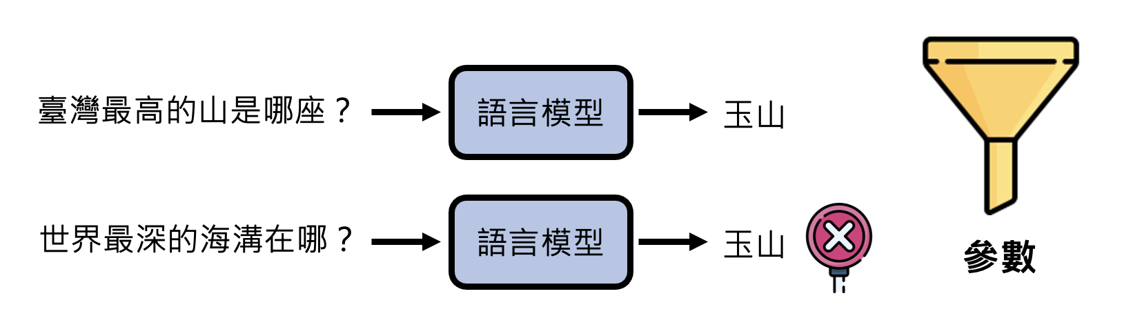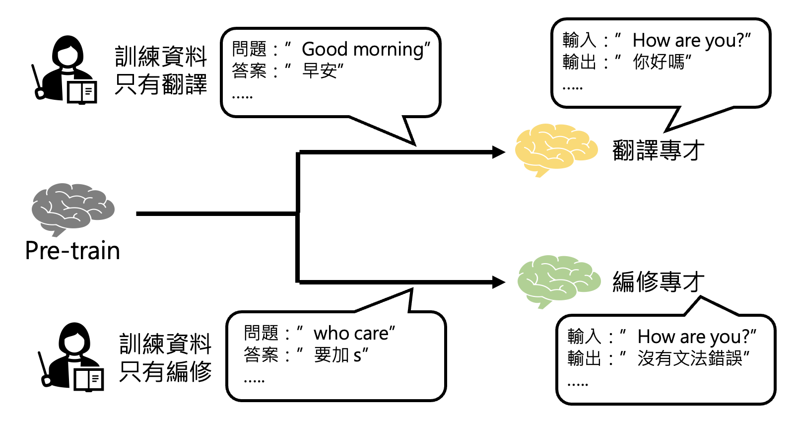 如果只靠人类老师来教模型的话(即仅使用监督学习,由于人力贵,无法收集很多数据,因此模型可能很容易从训练数据中学到错误的参数(在训练数据中是没有问题,但一测试就露馅了