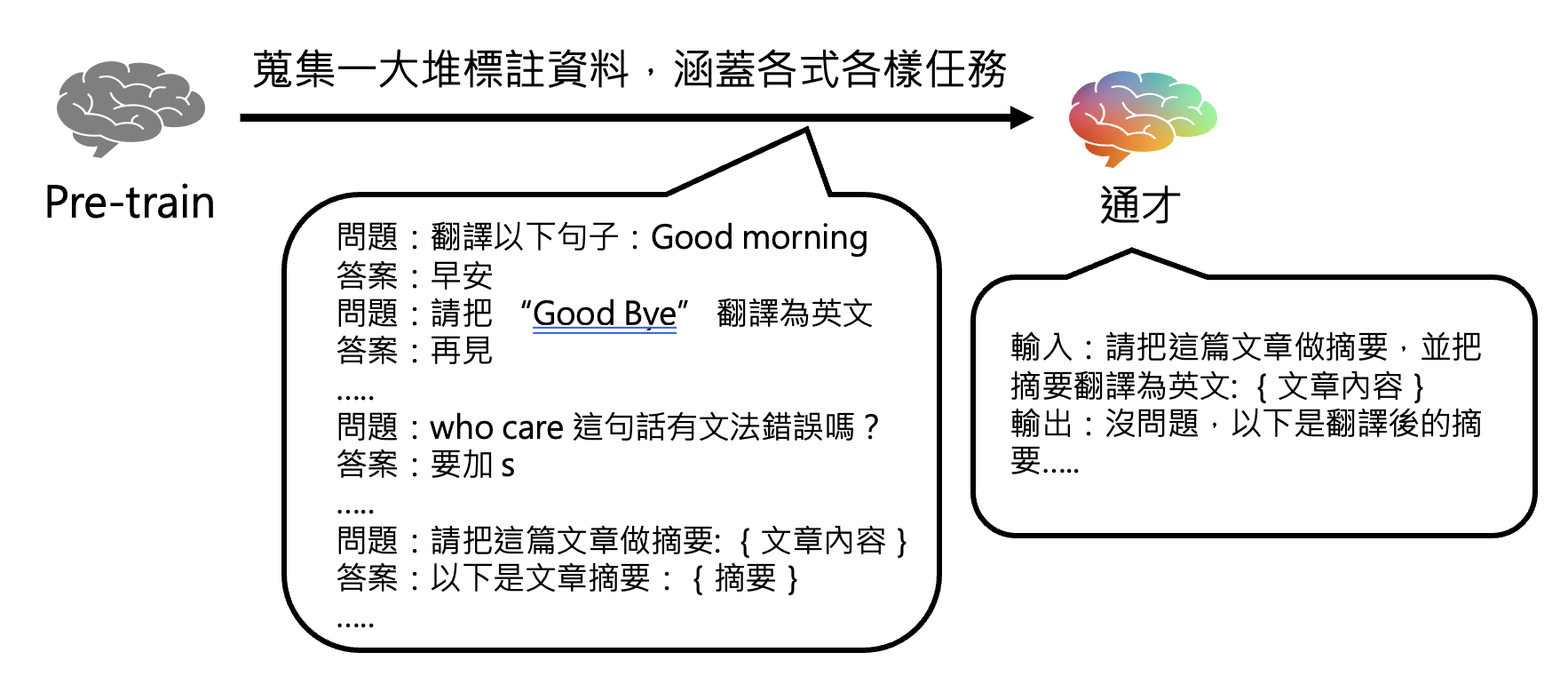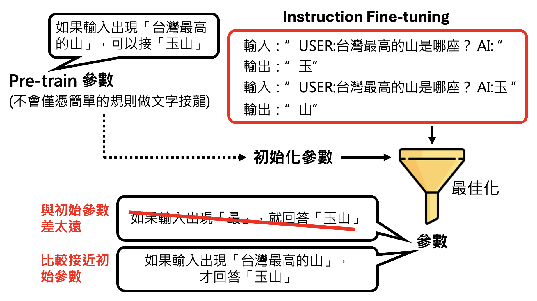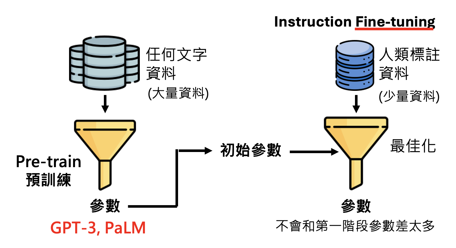 所以用到第一阶段的参数作为初始参数就相当关键了:先让模型在大量网络数据中做训练(称为预训练(pre-train),用训练得到的参数作为初始参数;再用人类标注好的数据(数量相对较少)来优化模型,这样得到的参数不会和第一阶段的参数相差很多,并且模型不会仅凭简单的规则来做文字接龙。因此,第二阶段被叫做指令微调(instruction fine-tuning)。