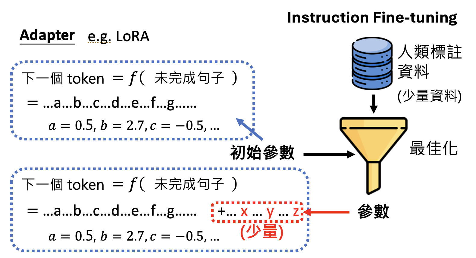 为了让两个阶段最终得到的参数相差不大,人们发明了一种叫做适配器(adapter) 的技术,比如 LoRA。它的做法是保留第一阶段得到的参数,但增加少量额外的参数;第二阶段的训练只更新新增的参数,固定原参数不变。这样两阶段的参数就比较相近了。