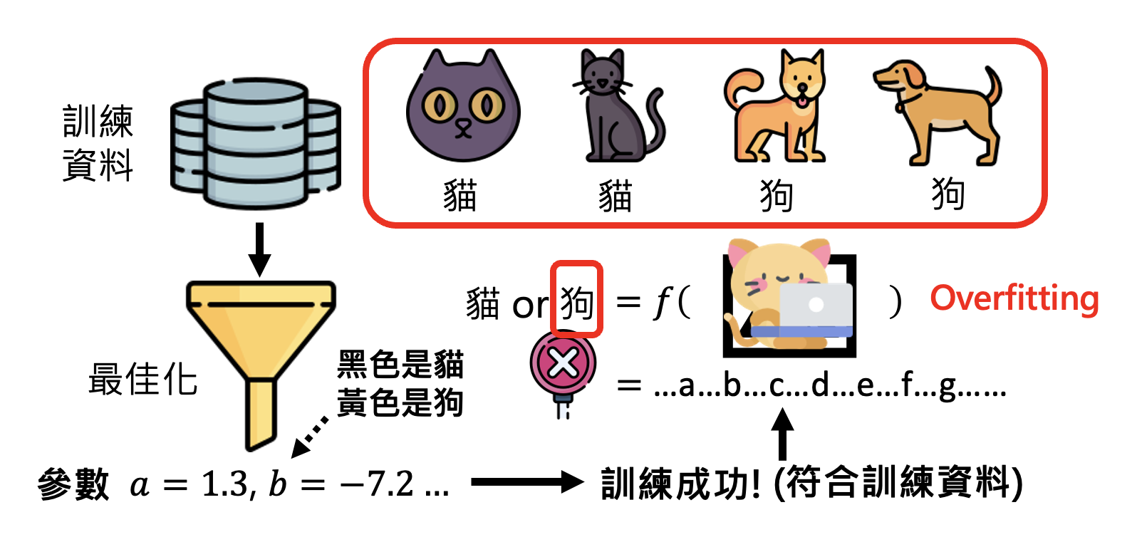 但即便找到了让模型训练成功的超参数,模型在测试中也有失败的可能。这种现象就是机器学习中常见的“过拟合”(overfitting)。比如对于下图的猫狗分类器,在训练数据中是 OK 的,但是一做测试就寄了。这是因为分类器从训练数据中学到了错误的参数——把黑色的动物当做猫,把黄色的动物当做狗。所以它在测试中看到黄色的猫时,就将其误判成狗了。