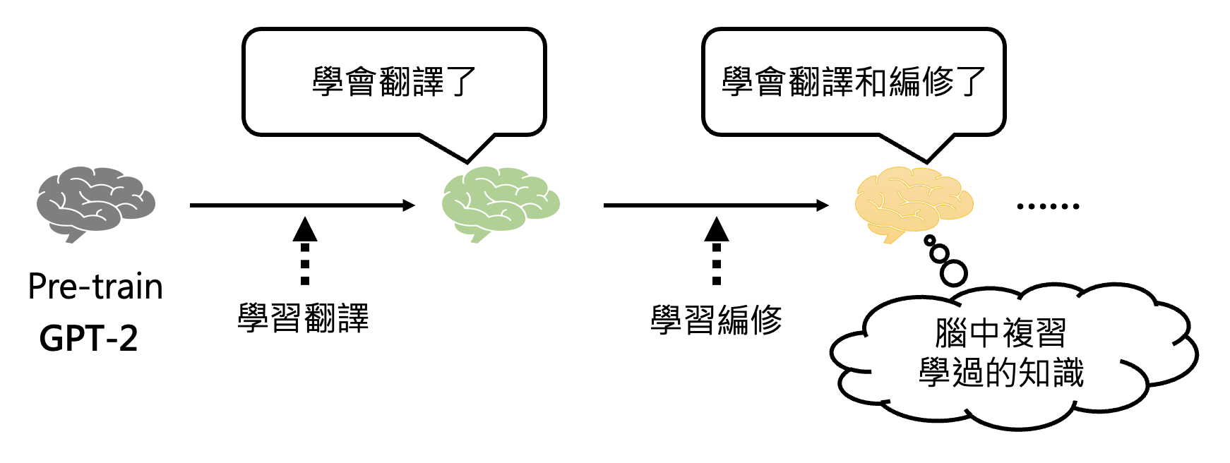 李宏毅老师团队早在 19 年就做过相关的研究(当时只有 GPT-2。为了让模型成为通才,他们采用的方式是让模型一个任务一个任务地学(终身学习 (life-long learning)。但这样做的一个问题是模型可能会忘记之前学过的任务。所以这个研究的一大贡献是设计了一种有趣的方法,让模型能够复习它学过的知识。