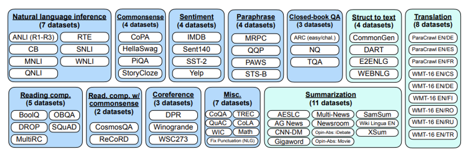 Google 21 年尝试打造过一个通才模型,叫做 FLAN (Finetuned Langauge Net),包含了以下训练任务。