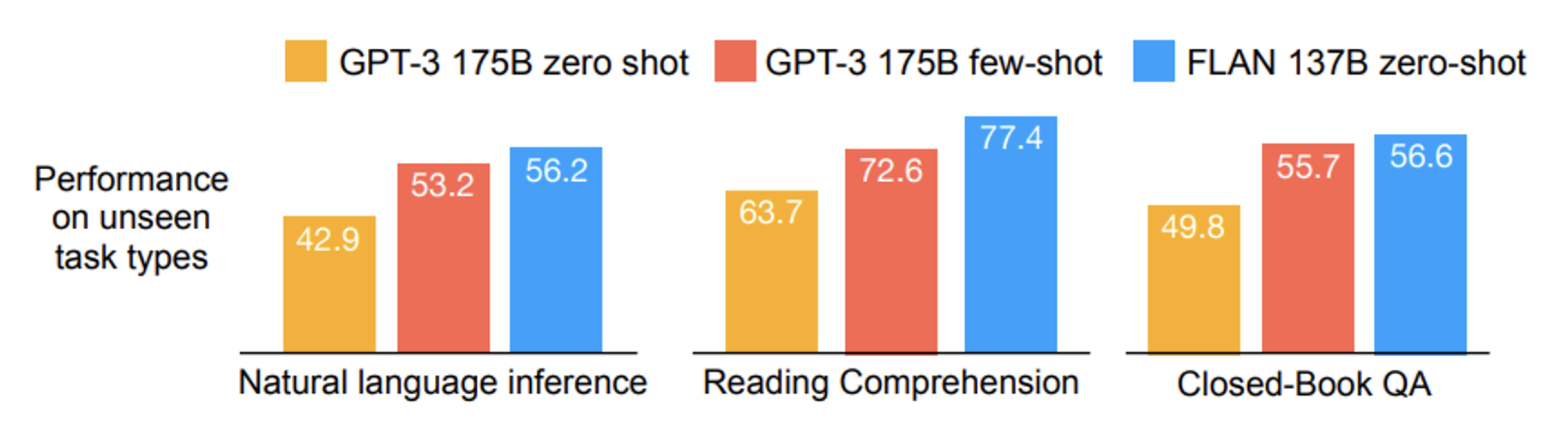 下图展示了 FLAN 的表现,可以看到它在各项任务中优于 GPT-3