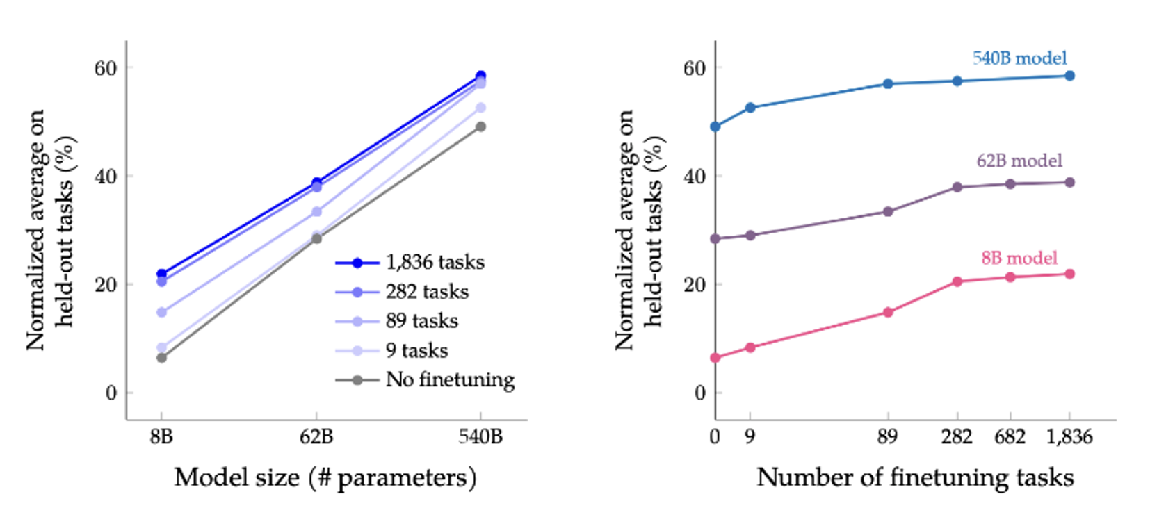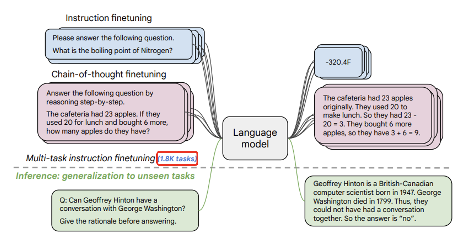 之后,Google 更进一步,用更多的任务(1.8K 个任务)来训练模型(研究名为 Scaling Instruction-Fine-tuned Language Models