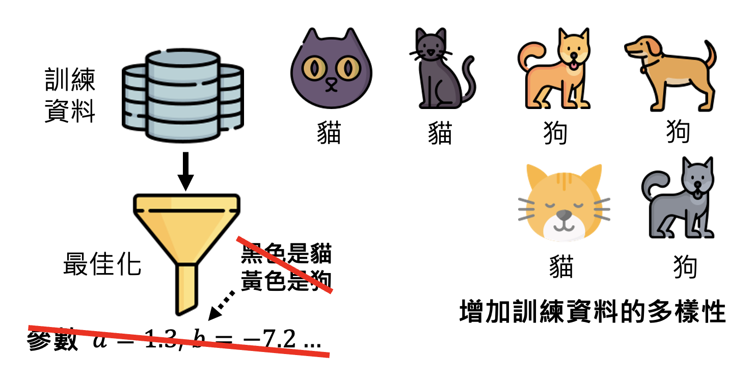 要想让模型找到比较“合理”的参数,一种方法是增加训练数据的多样性(比如数据增强。对于上面的例子,就可以往训练数据中放黄色的猫和黑色的狗,这样至少不会让分类器把颜色作为区分猫狗的唯一标准。