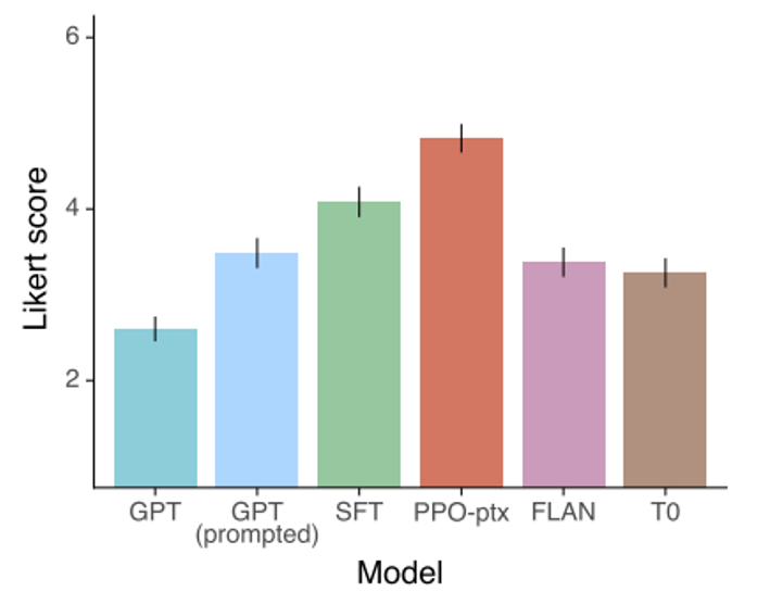 OpenAI 也发表了相关文章 Instruct GPT。它在 GPT-3 上做微调后(绿色柱子)的表现比 FLAN 还好。