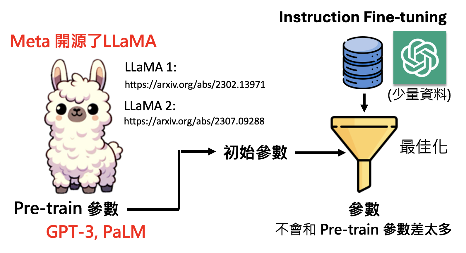 现在即便有了来自 ChatGPT 的高质量的数据用于指令微调,但我们仍然没有自己的初始参数,因为 OpenAI Google 的模型基本上是闭源的(不过最近 OpenAI 公布了开源模型,时隔 6 年终于 open 。这便是开源模型登场的时候了。下面就以 Meta LLaMA 为例展开介绍(课程开设于 24 年上半年,当时国内开源模型可能还没那么知名LLaMA 1LLaMA 2