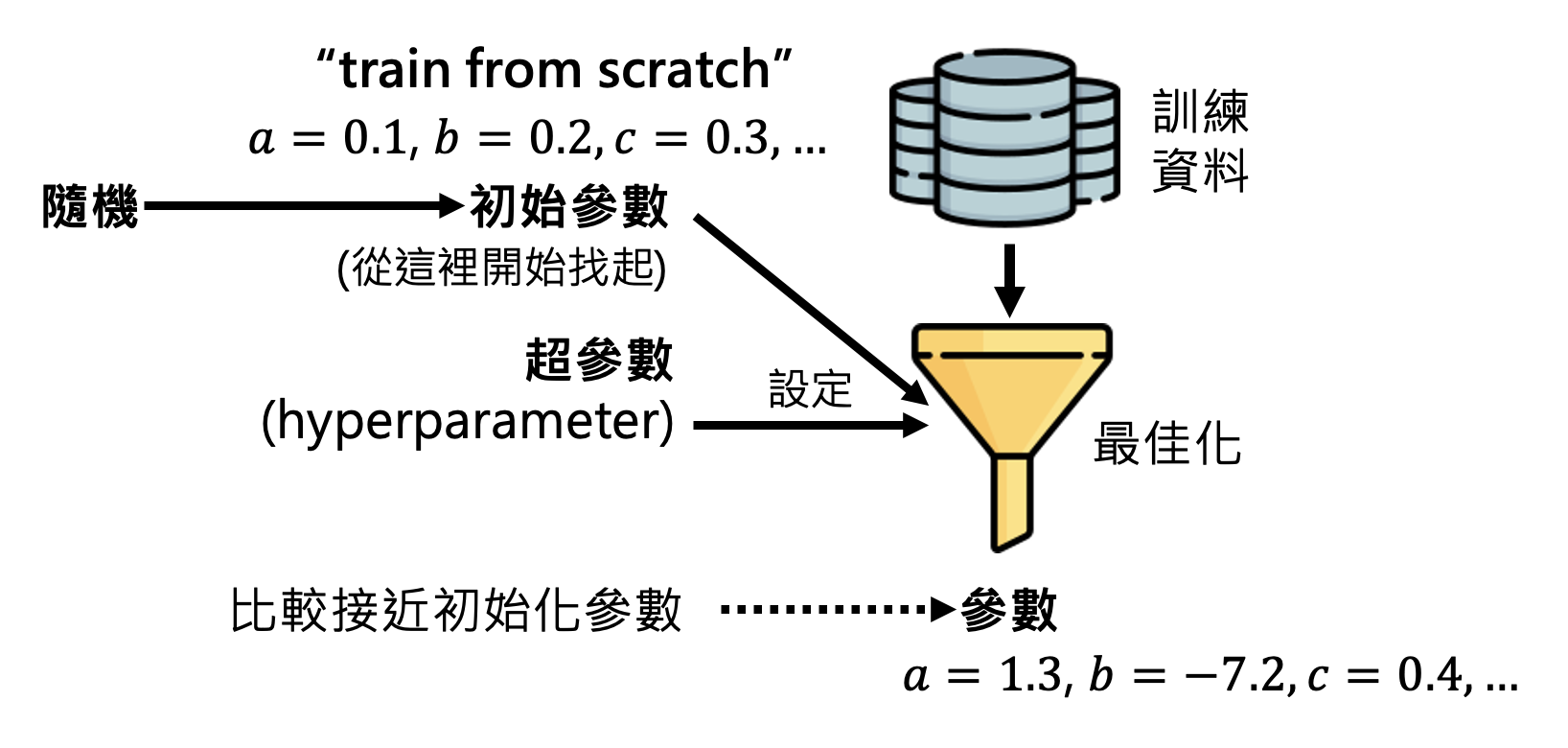 另一种方法是设置好初始参数(注意不是超参数,这些参数会在训练过程中不断更新。由于模型会基于初始参数的配置来看待训练数据,所以优化后的模型参数可能和初始参数比较接近。通常我们不清楚该如何设置初始参数,所以一种常见做法是随机设置初始参数,这种方法叫做从头训练(train from scratch)。