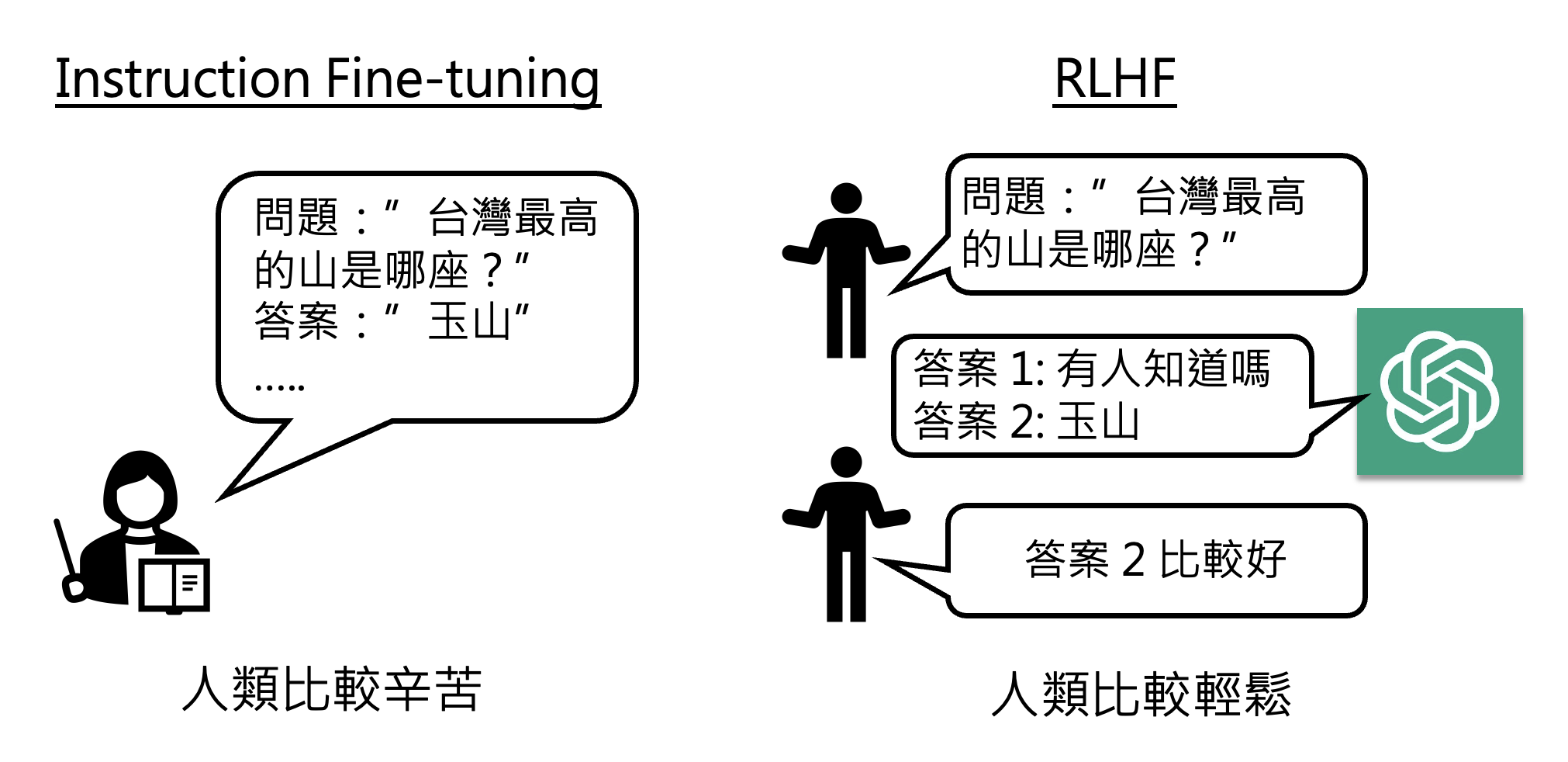 并且有时人类不容易构造正确答案,但是容易判断答案的好坏,这也是 RLHF 的一大优势。