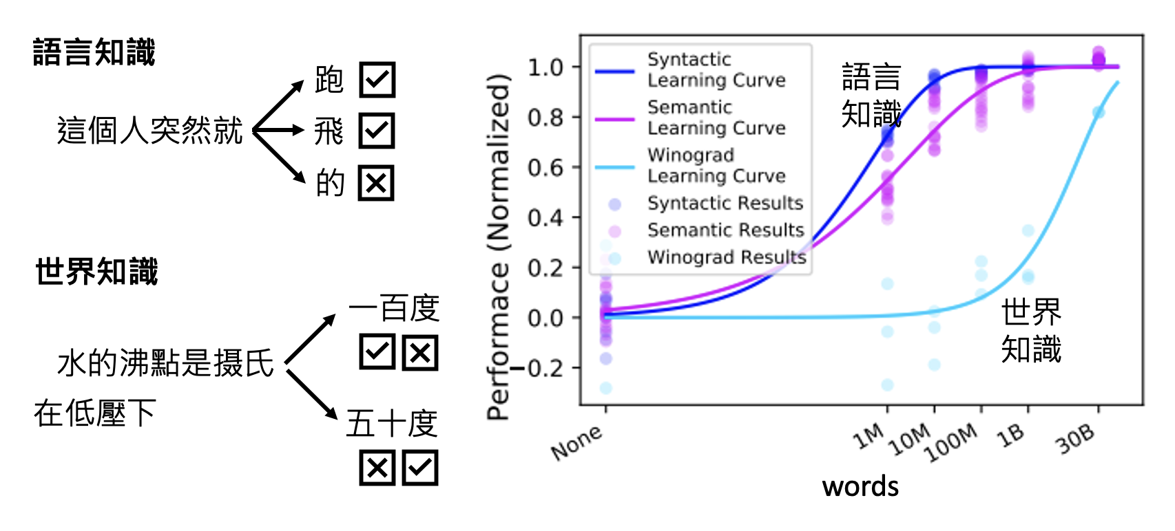 我们知道语言模型的训练就是让模型学会做文字接龙。那么模型到底需要多少数据才能学会这一本领呢?看模型是否掌握文字接龙的本领,除了看它是否理解语言知识外,还要看它是否理解世界知识(比如是否符合自然规律等等。下面便是有关这一标准的研究结果: