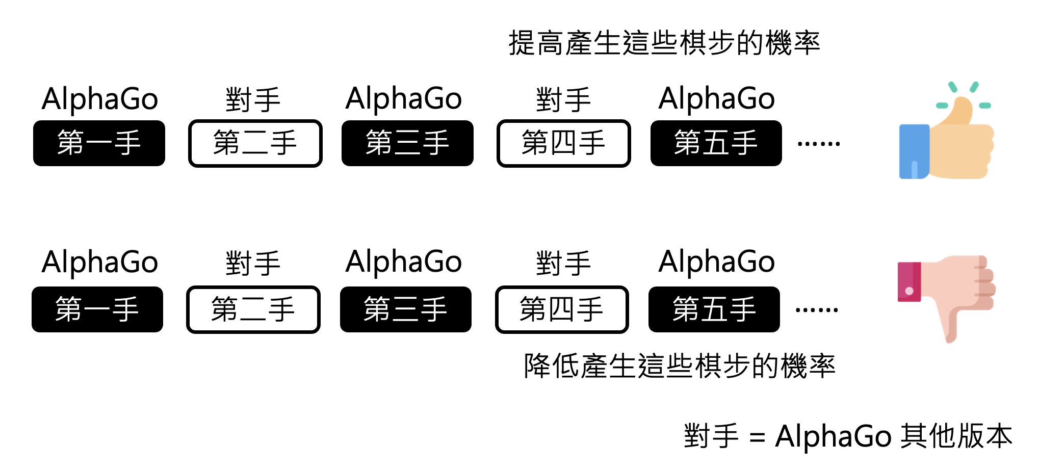 AlphaGo 如果仅凭棋谱学习的话,那也只能打赢一般的选手。如果需要击败顶尖高手的话,需要借助 RL 的力量。具体来说: