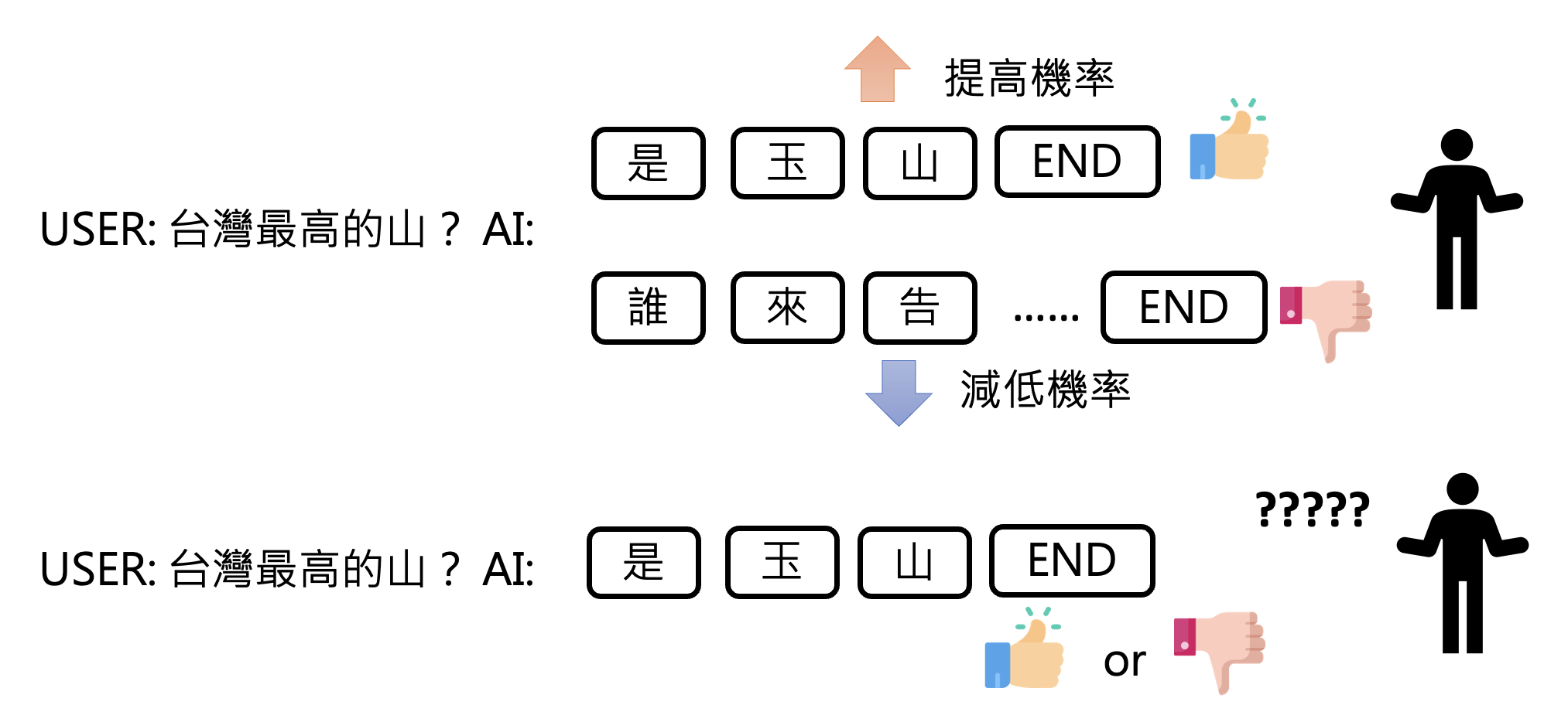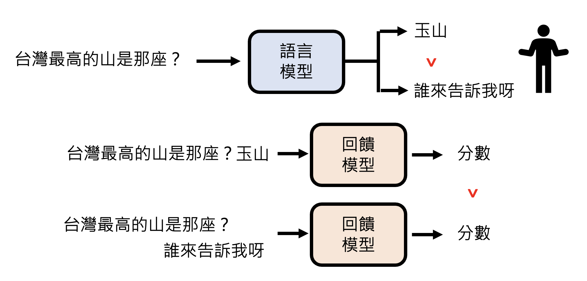 不过人类的时间精力有限,能提供的反馈也是有限的。所以对语言模型而言,如何有效利用人类反馈是一个关键的议题。一种做法是根据人类的反馈,创建一个虚拟的人类,语言模型在 RL 时就直接问这个虚拟的人类,而不是真的人类。这种“虚拟的人类”就是奖励模型(reward model)。