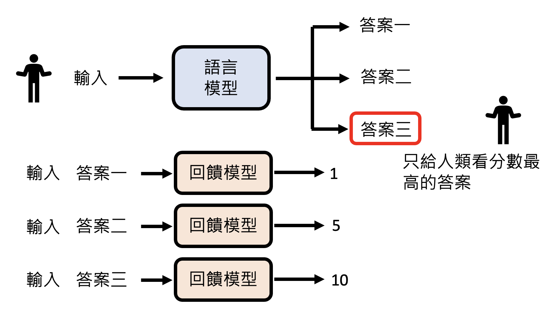 训练好奖励模型后,人类就只采纳那个能在奖励模型中得分最高的那个答案。