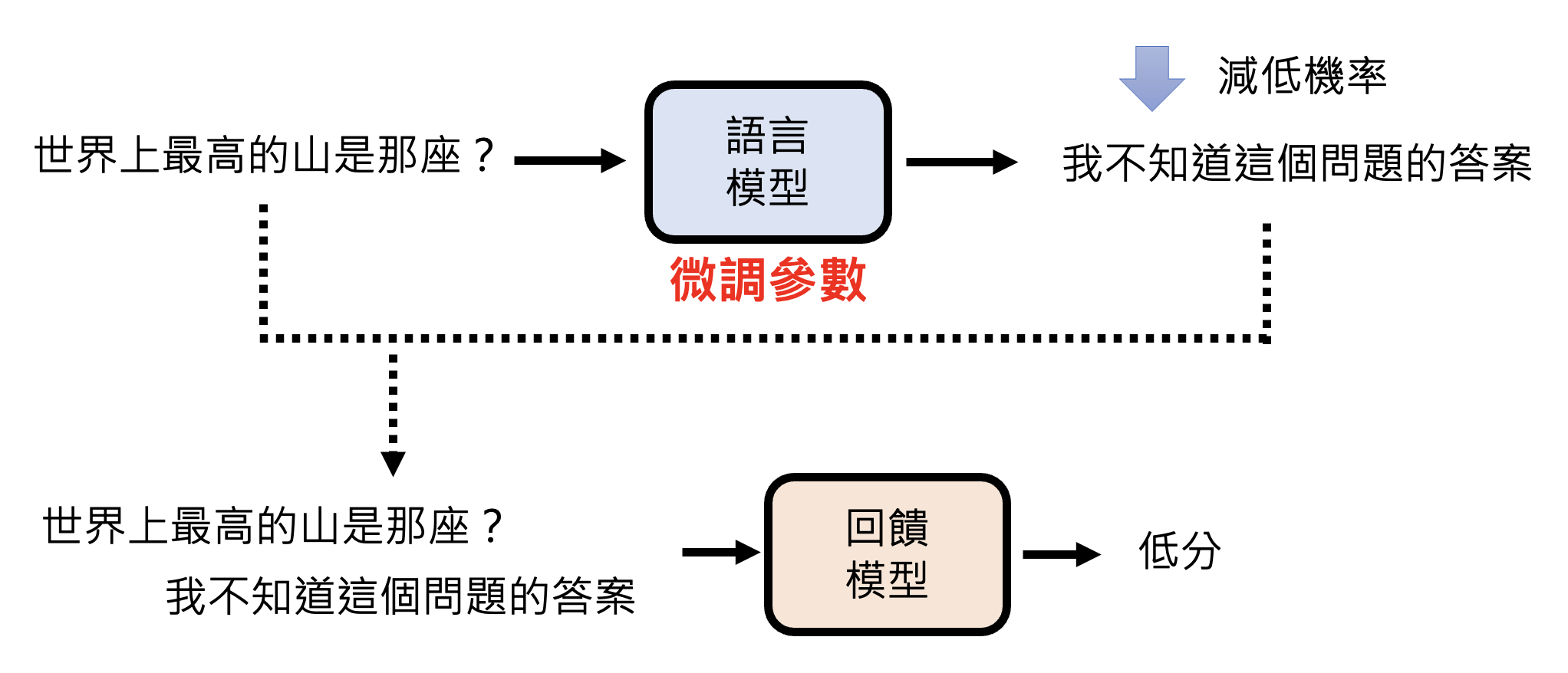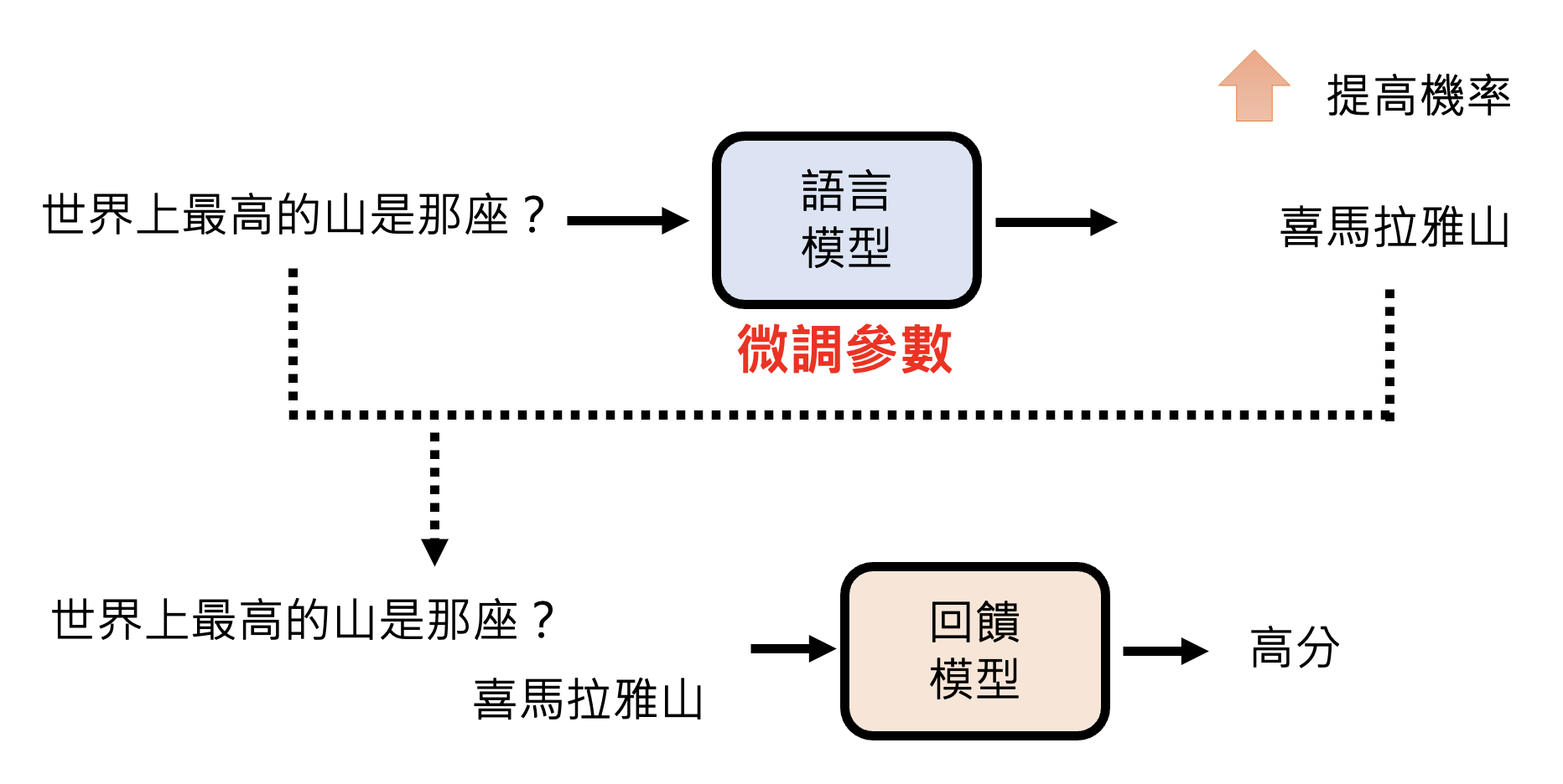 但现在奖励模型更常见的用法是让语言模型直接根据奖励模型学习,即直接将语言模型的输出丢给奖励模型,看奖励模型给出什么样的分数。如果分数高,通过微调参数让语言模型输出这个答案的概率变大,反之则变小。