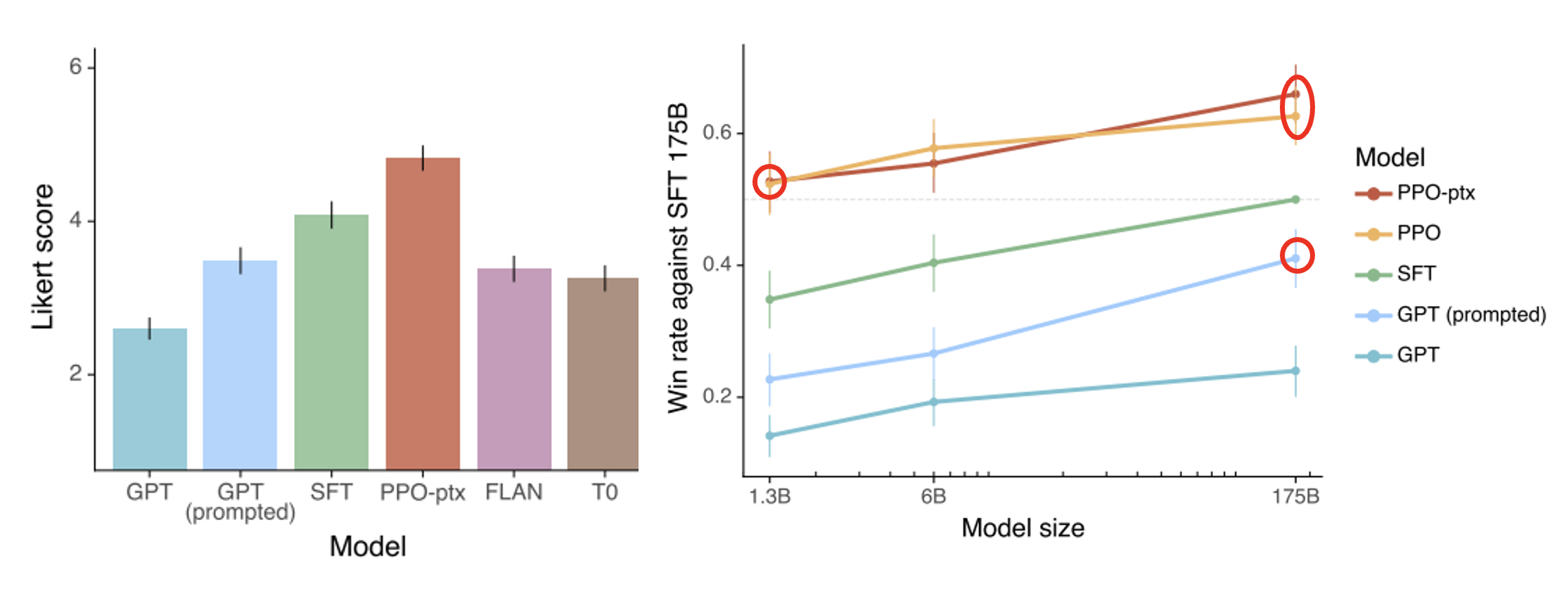 回到前面 Instruct GPT 的研究,当时我们没有考虑最高的那根柱子,它对应的就是 RL 后的模型表现。而右图的曲线图表明,即便是参数量较少的模型,在 RL 后其表现仍能胜过参数量大的模型。