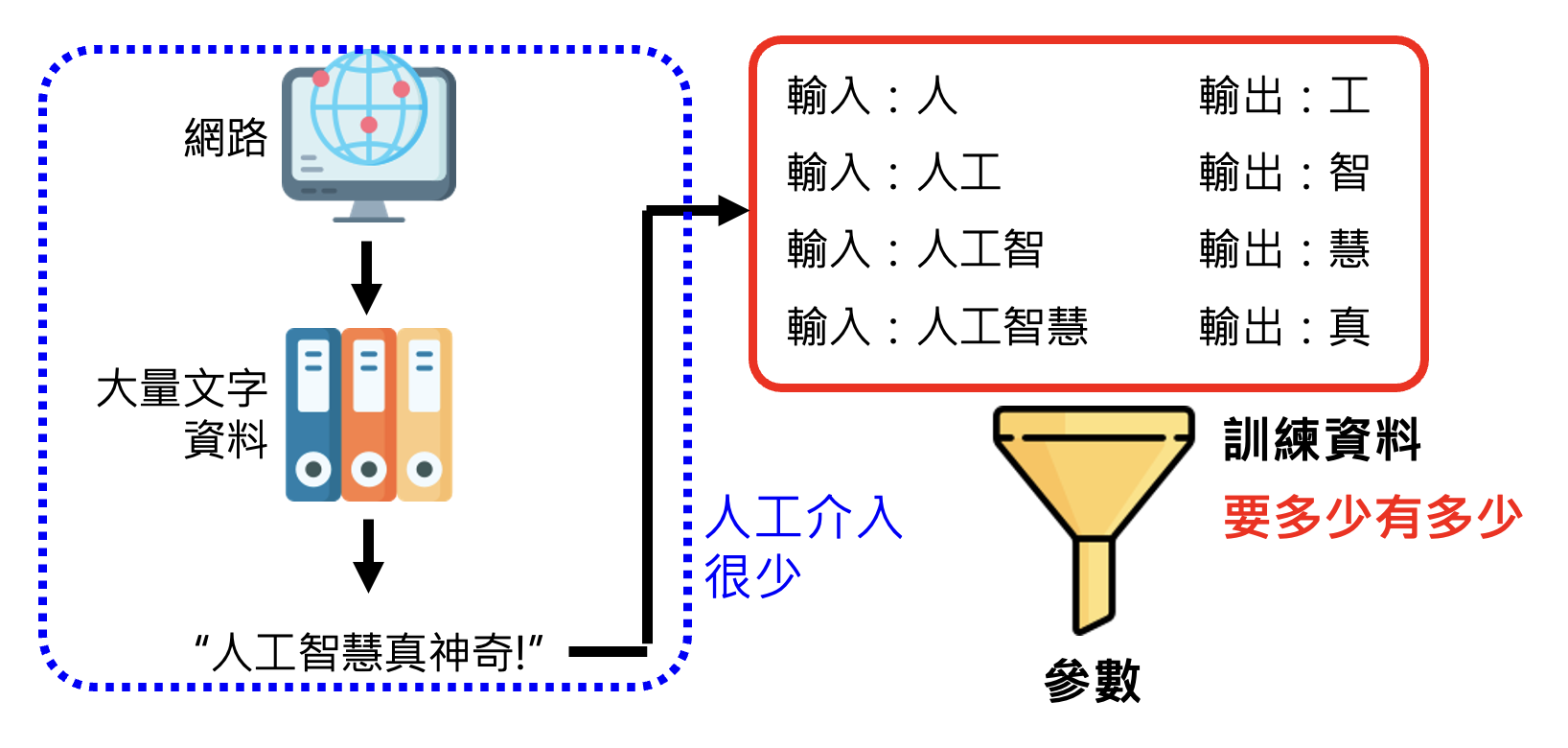 可以看到,相比语言知识,要学到复杂有层次的世界知识,就需要大量的训练数据。我们可以拿任何的文字数据作为训练数据使用,而网络正是大量文字资料的主要来源。根据网上爬下来的大量数据对模型训练的时候,人工的干涉很少,因此我们称这种学习方式为自监督学习(self-supervised learning)。