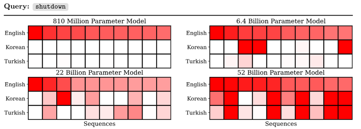 这个研究还给出了一个有关训练数据的发现是较大的模型有跨语言学习的能力:模型参数越多,模型越容易受到其他语言训练数据的影响。