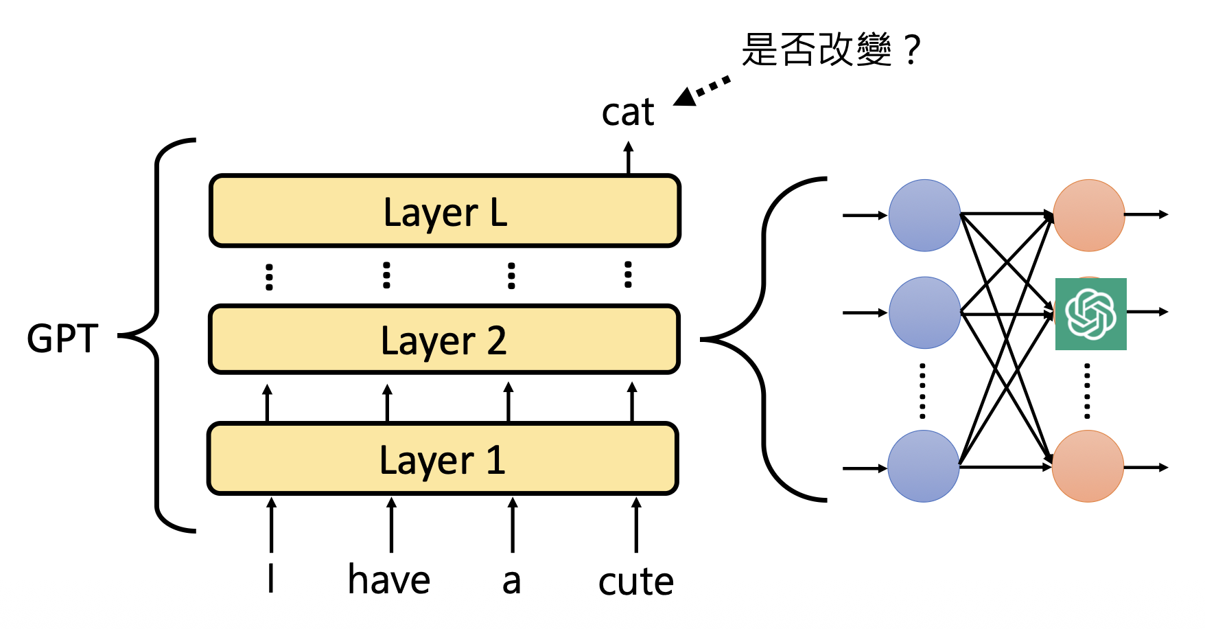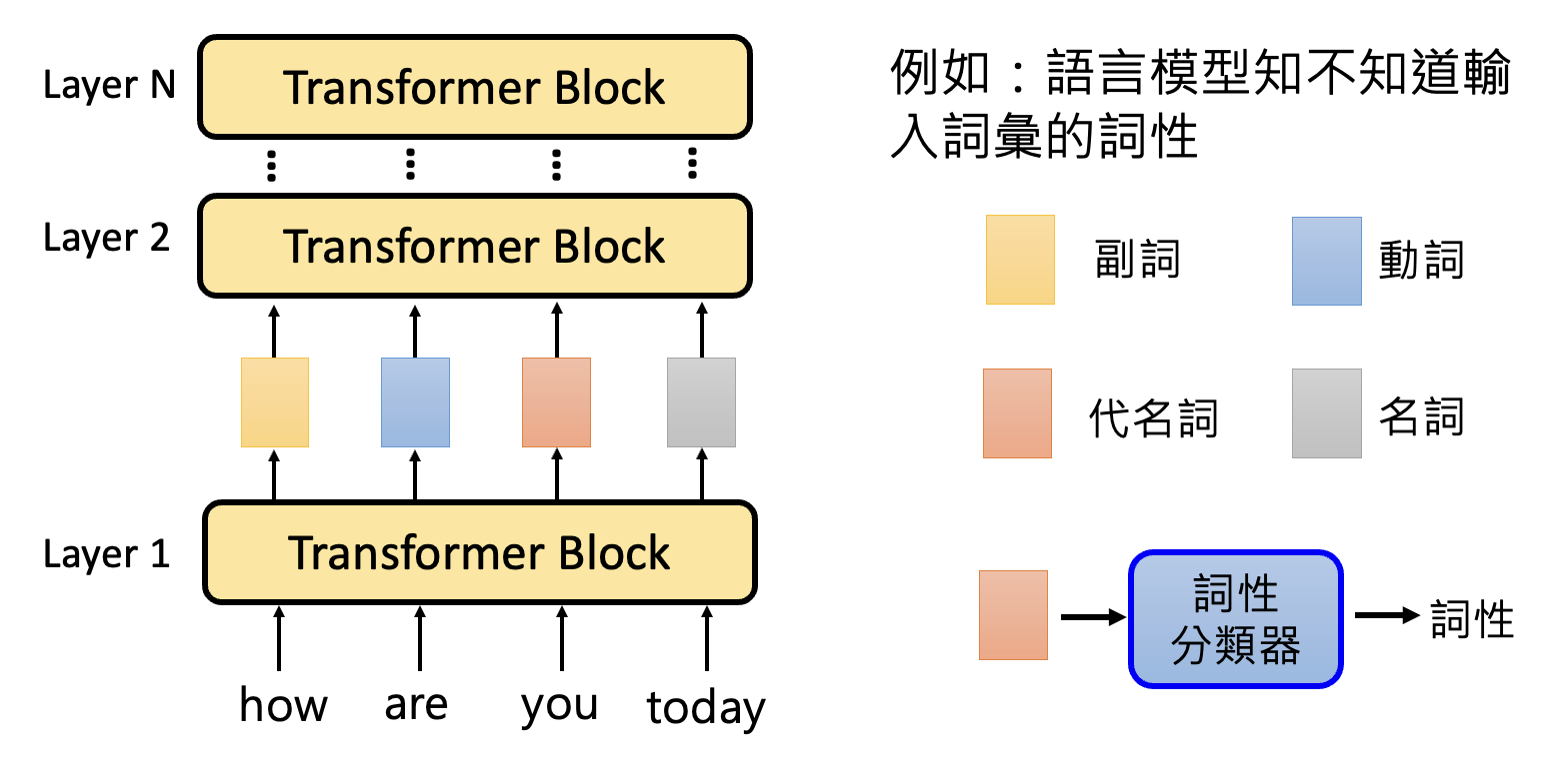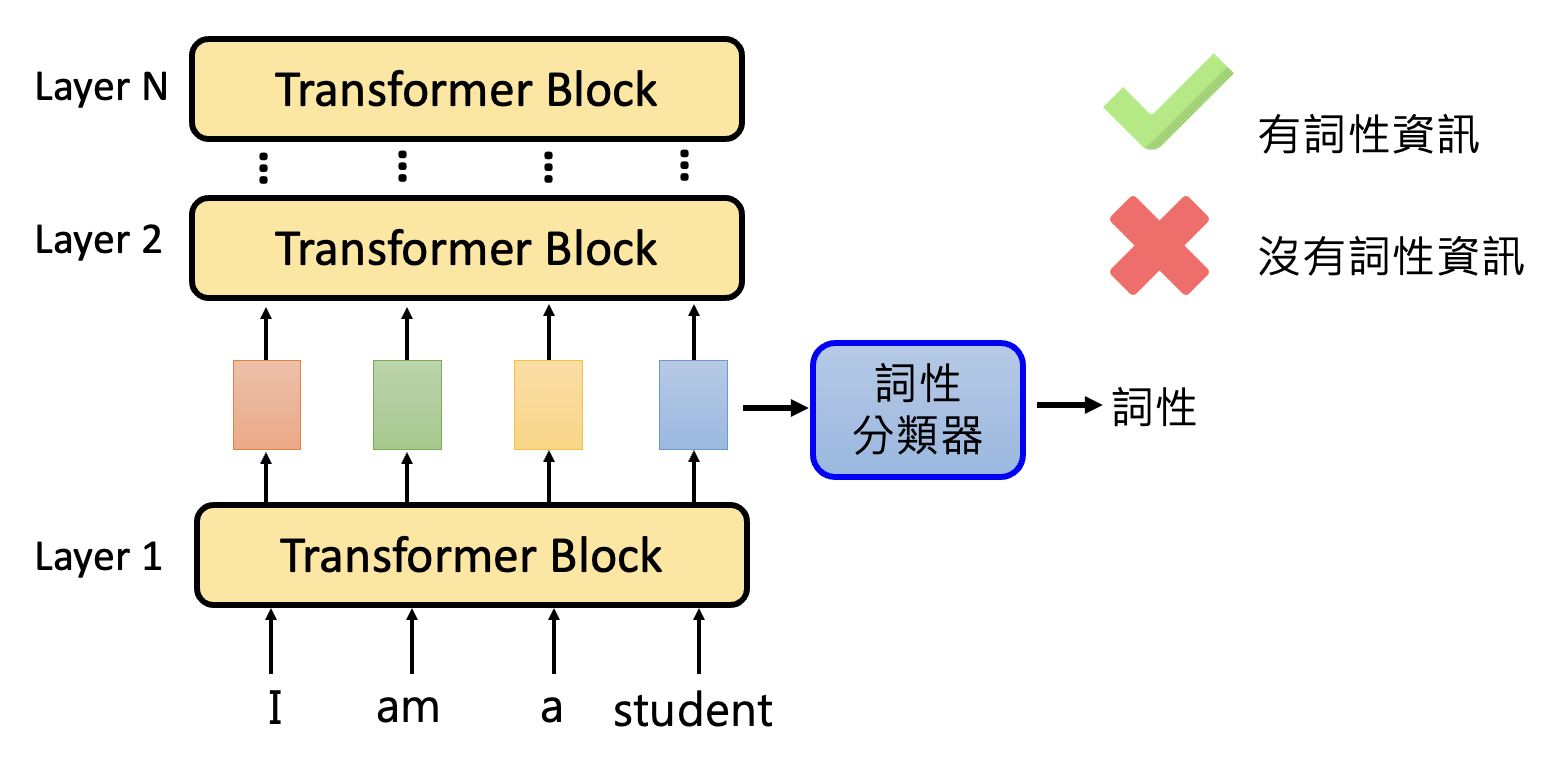 以做词性分析 (POS) 的语言模型为例,我们想知道这个模型中间产生的嵌入向量是否已经具备了关于词性的信息。为此,我们可以训练一个词性分类器,取某一层的输出嵌入向量作为分类器的输入,输出某一词性(类别