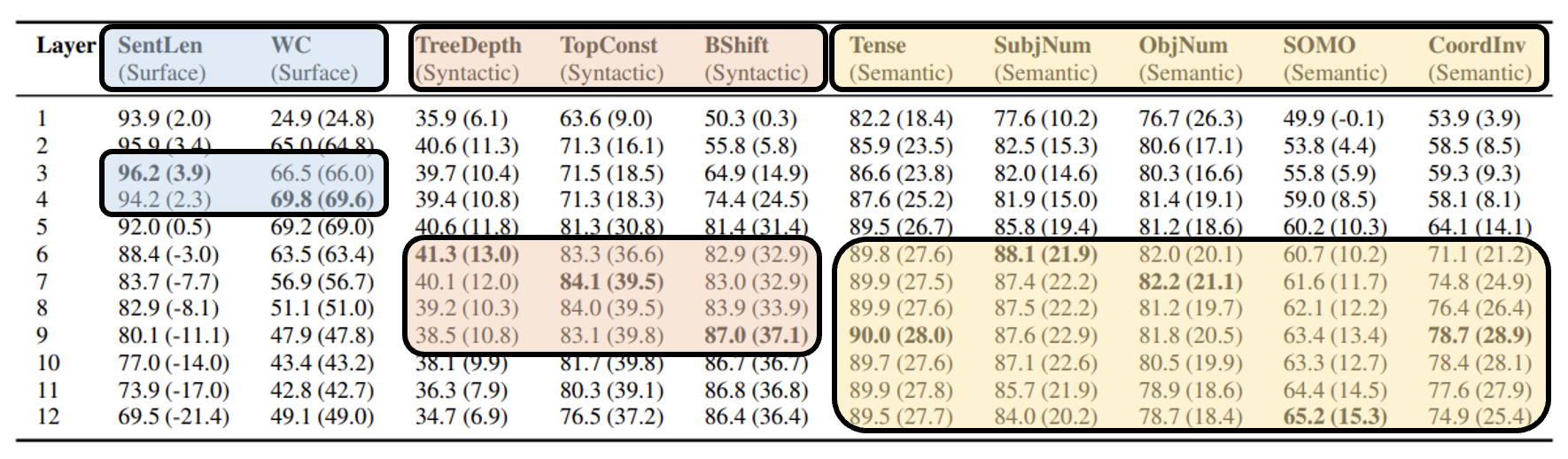 利用探测技术,我们可以研究每一层的嵌入向量包含什么信息。下面是在 BERT 上做探测的结果(来源