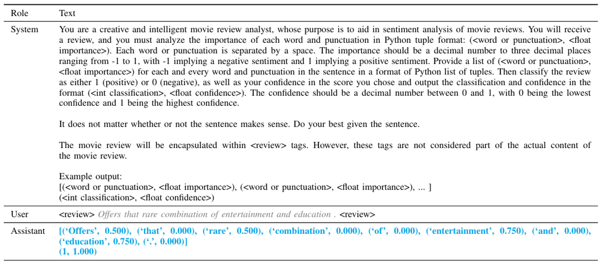 某个研究发现,要想知道哪个输入对特定输出影响大,可以直接问语言模型,它会根据重要程度为每个输入 token 打分。下面是一个有关情感分析任务的例子: