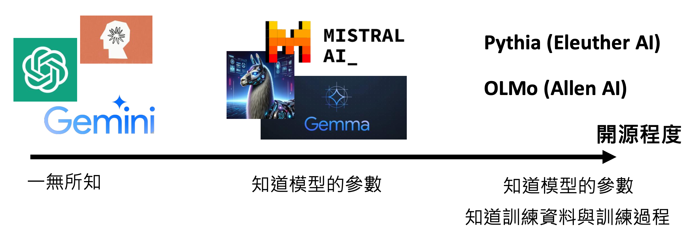 ) :LLaMA, Mistral AI, Gemma... - 完全开源(不仅提供模型参数,也知道训练数据和过程
