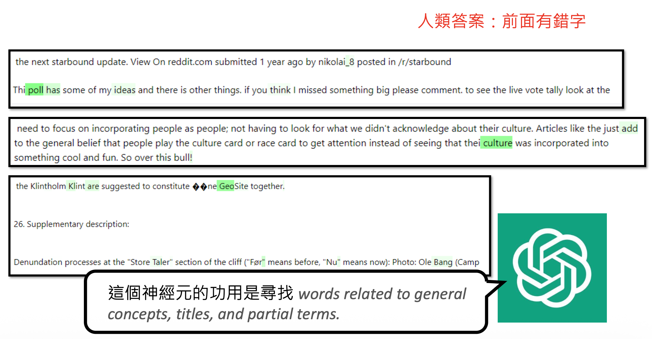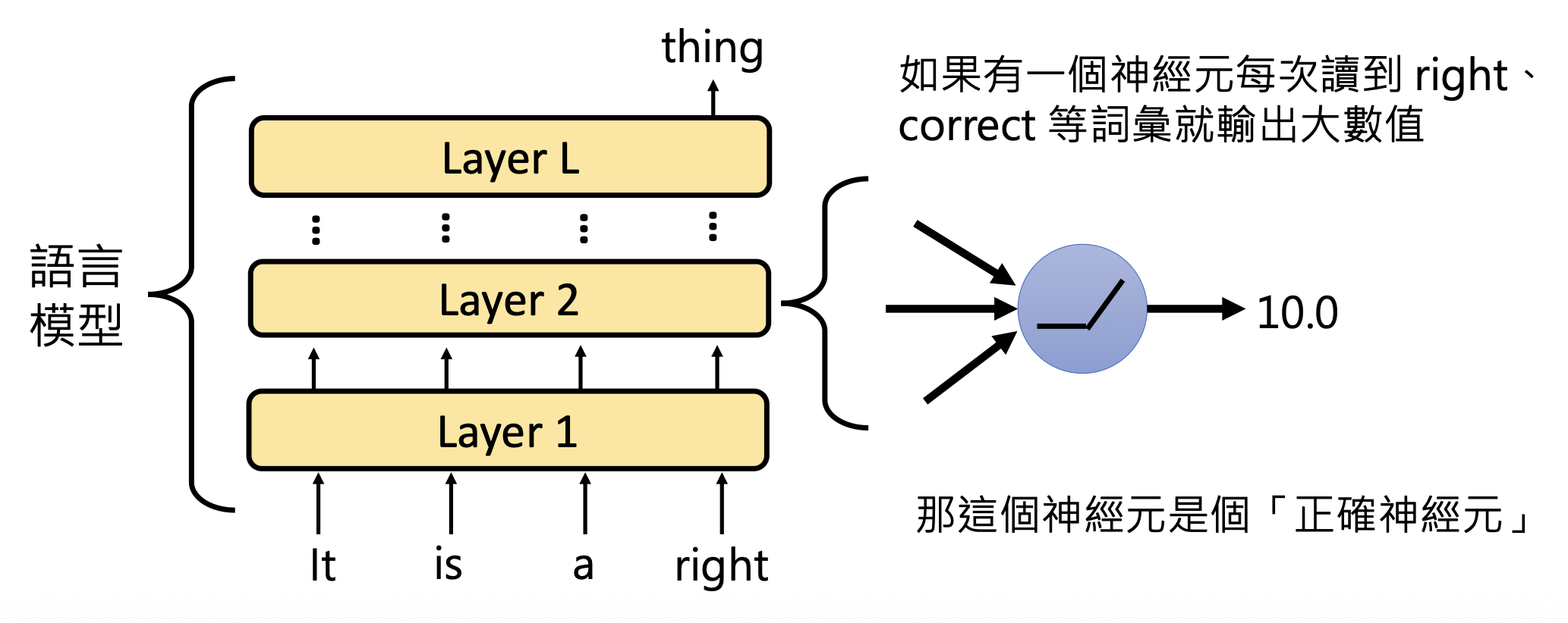 首先遇到的问题是如何知道一个神经元的作用呢?我们可根据神经元何时被激活 (activate) 来猜测它的作用。比如某个神经元每次看到诸如 right, correct 等词时就给一个很大的数值,那么它的作用可能就是负责和“正确”意思相近的词汇。