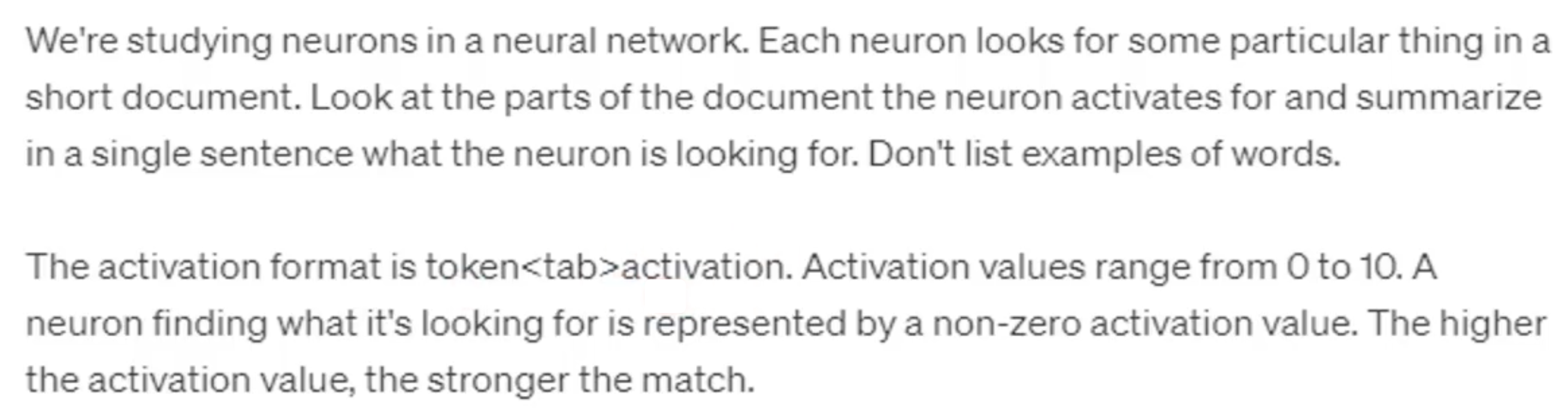 接下来要考虑的是如何将神经元为每个词汇给出的分数丢给 ChatGPT。OpenAI 给出了它们构造的提示词,包括任务描述、神经元激活值的输入格式(做了归一化处理)等。