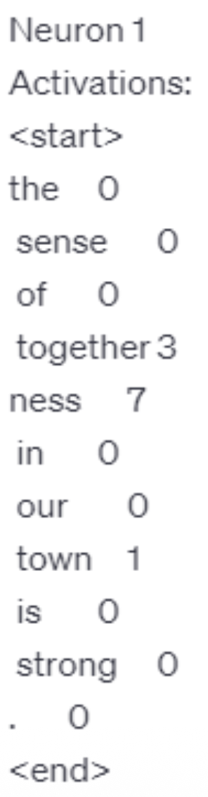 回过头来看解释者模型给出错误解释的一个例子。如果让解释者仅参考以下数据的话,它会凭借“直觉”选择待解释神经元有输出较大的句子,比如这里它会认为神经元的作用是寻找 "all"。