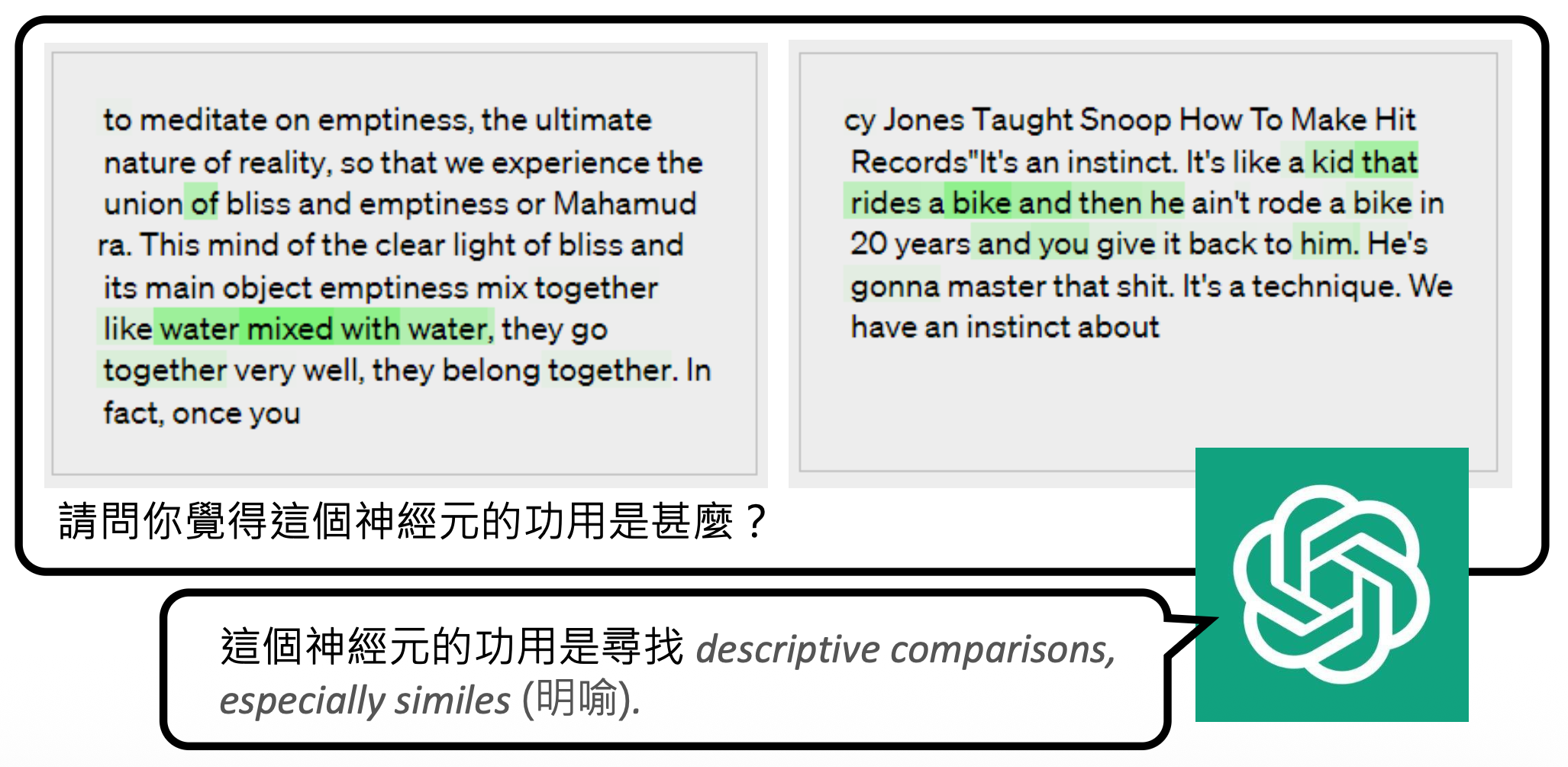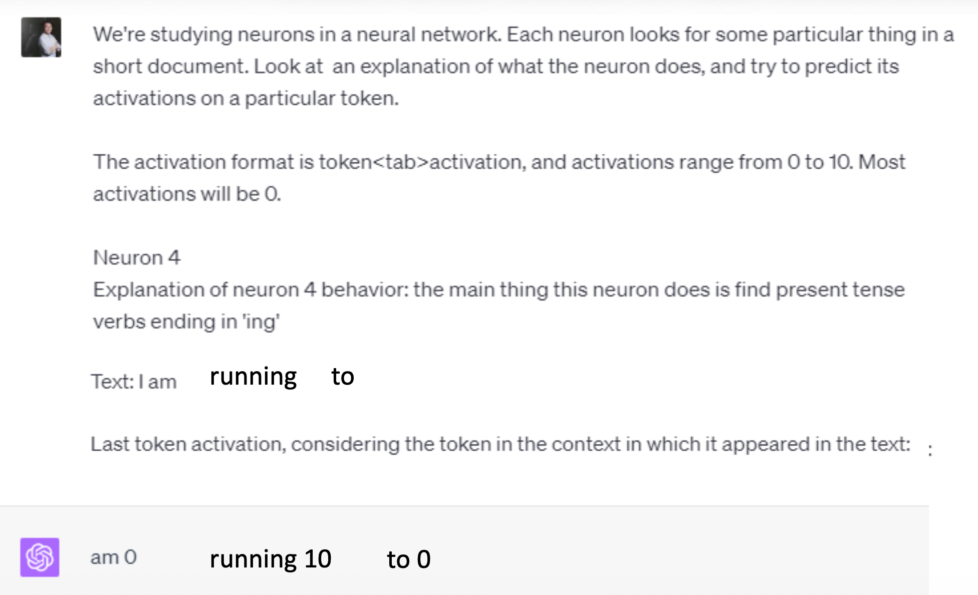 最后向模型发问,模型随后给出对神经元的解释:
