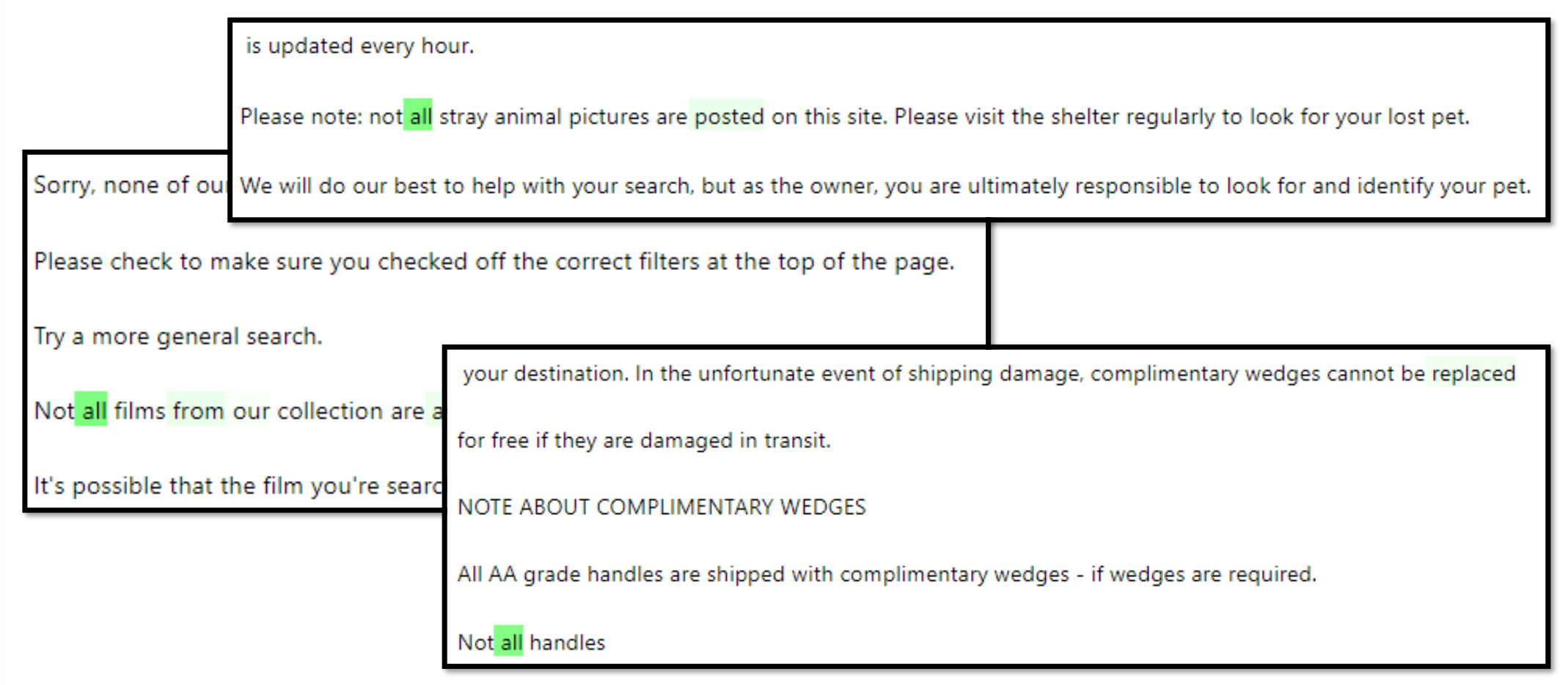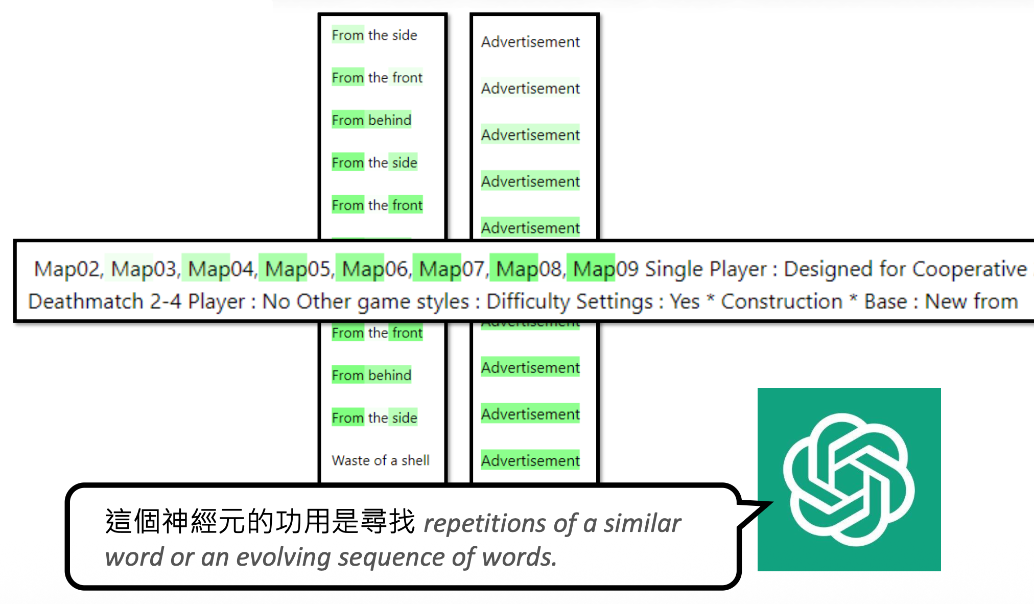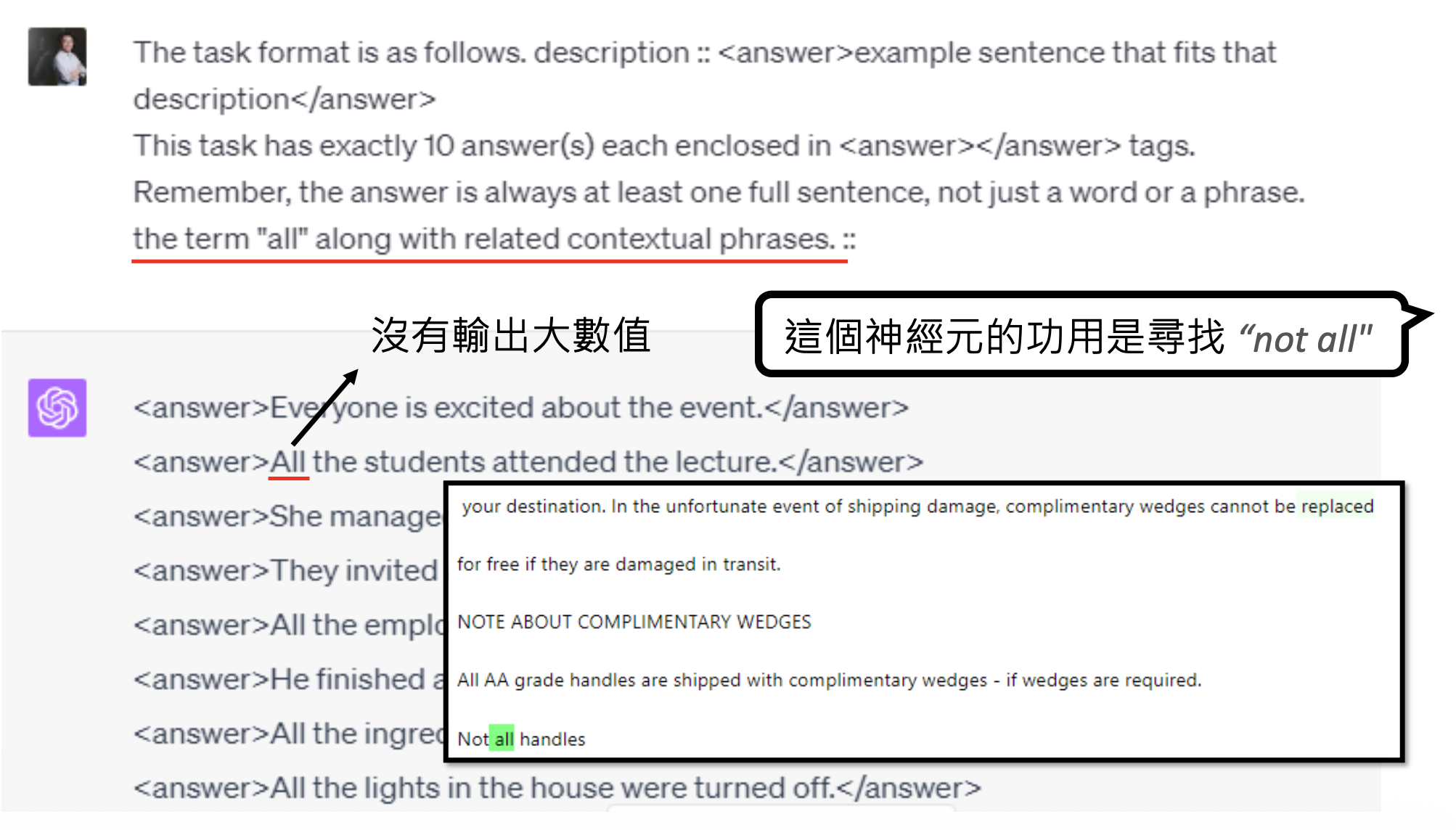 但实际上这个神经元的作用是寻找 "not all",模型没有注意到训练数据中每个 "all" 前面都有一个 "not"。为了避免让解释者模型犯这样的错误,我们可以另找一个模型来构造更多的数据。比如这里就让它构造仅带 "all" 的句子,这样的句子在对象模型的神经元中分数不高。解释者在看到这样的结果后,就不会再给出相同的错误解释。