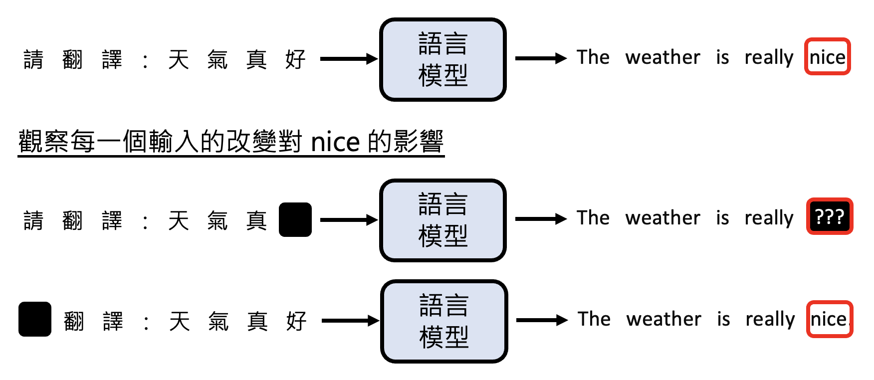 第一个方向是寻找影响输出的关键输入。以机器翻译为例,假如想知道翻译后的某个词是否真的对应输入的那个词,也就是想知道模型是否真的理解这个词的意思,那么可以把输入中的每个词遮(mask) 一下,看看对翻译后的那个词的影响。