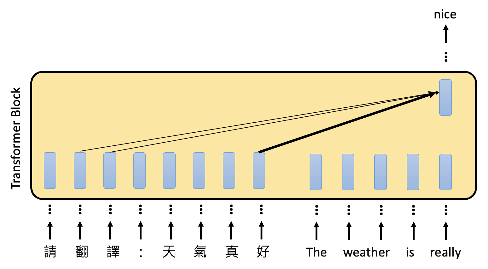 - 简单来说,对于某个输出 token 的向量,看哪个输入 token 向量的注意分数最高,最高的那个就是关键输入