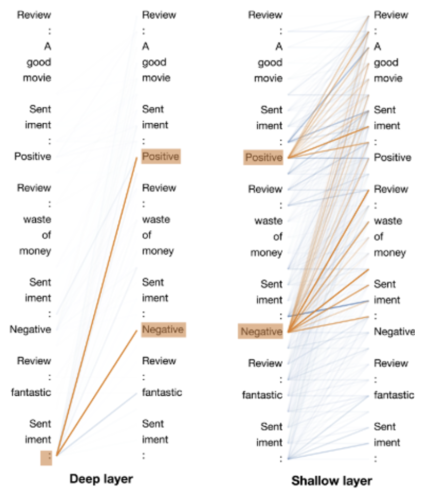 有研究分析了在上下文学习的过程中,语言模型的注意层发生了什么。示意图如下(这里要竖着看输入和输出的内容,并且从右向左看层的深度越深