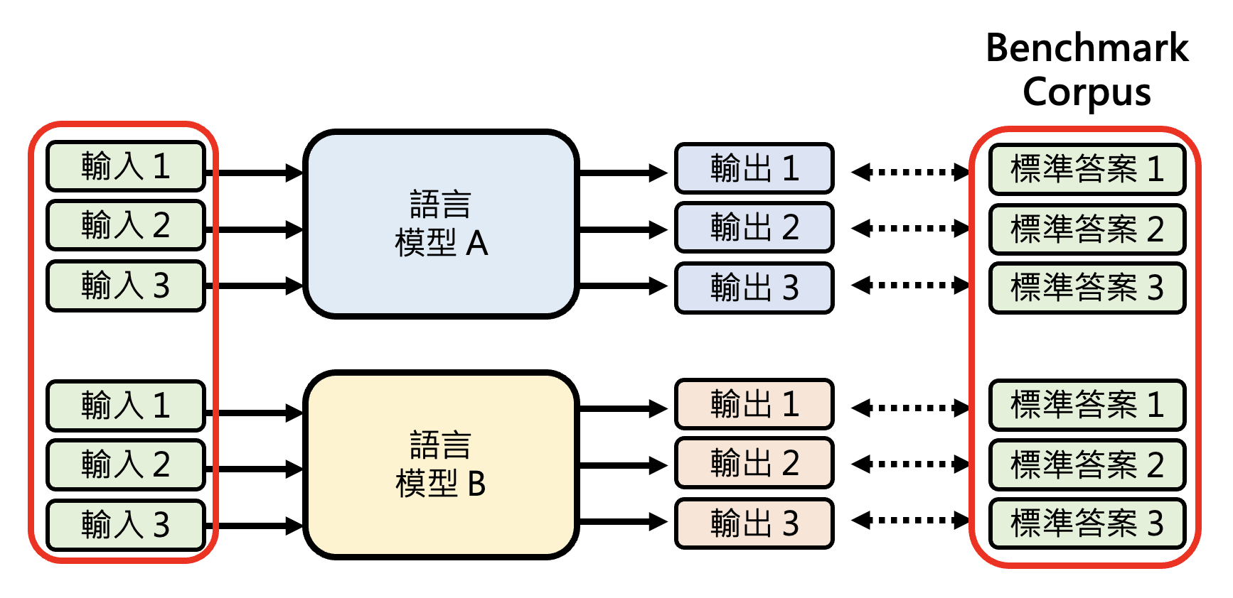 本讲将介绍和语言模型能力评估相关的话题。首先来看评估的基本思路:对于语言模型 A 和 B,喂给它们相同的输入,看它们给出的答案是否和标准答案接近。其中这组输入和对应的标准答案被称为基准测试集(benchmark corpus)。
