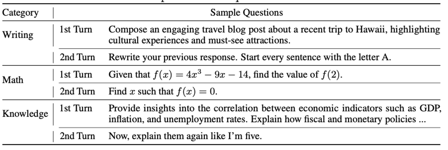 有一个知名的基准测试集 MT-Bench 就是用语言模型(GPT-4)来评估的。之所以它要用语言模型来评估,是因为里面的问题没有一个是有标准答案的,比如: