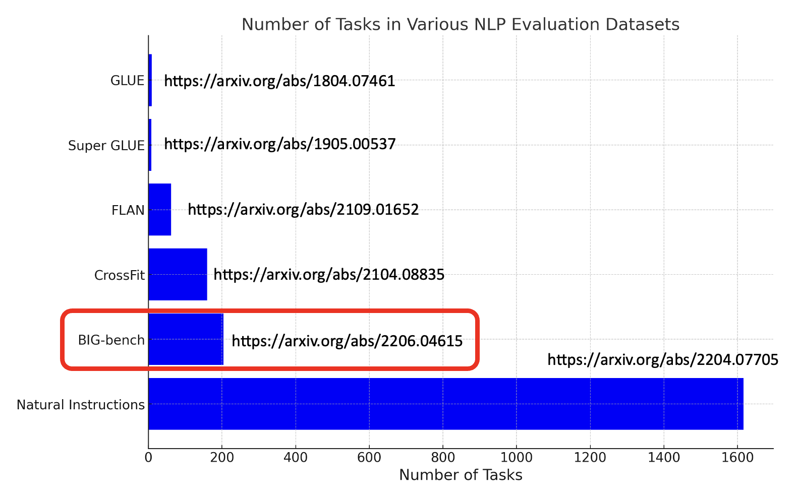 在评估语言模型能力的时候,除了要决定如何根据标准答案判断输出的正确与否外,还有一个议题是我们要向模型问什么。为此我们需要准备各式各样的任务,下面就整理了一些在 NLP 领域中知名的基准测试集: