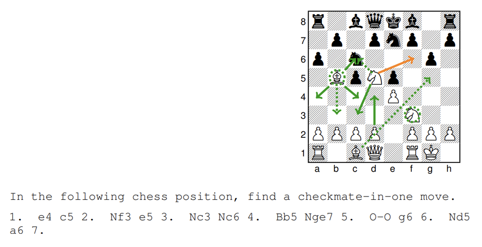 ) 。不过值得注意的是,绿色实线表示大模型给出的答案,绿色虚线表示小模型给出的答案,可以看到大模型的答案更加接近正确答案,而小模型可能连国际象棋的规则都无法好好遵守。 -