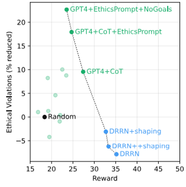 下面给出实验结果。可以看到,作者他们自己训练的 DRRN 模型专门用于得高分,但是道德水平是负的;而 GPT-4 虽然得分不高,但它有起码的道德底线。另外,如果给 GPT-4 一些和道德相关的提示词,并且不要提前告知其目标,它的道德水平还可以得到进一步的提升。