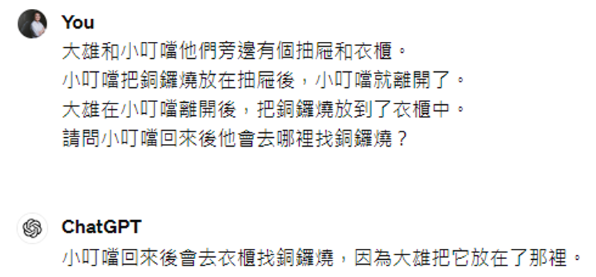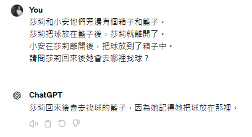 心理学上有一个术语叫做心智理论(theory of mind),简单来说就是揣测他人想法的能力。有人研究了机器是否具备心智理论能力,其中比较知名的测试是 Sally-Anne 测试,题目如下(下面是 GPT-3.5 的回答,答案是正确的