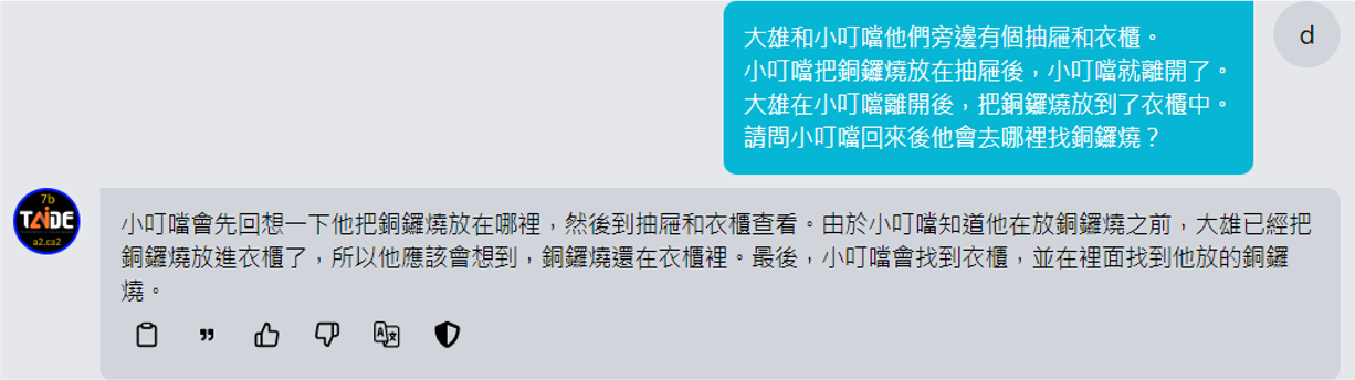 GPT-3.5 出错了,说明它实际上还没有理解这个问题。让 TAIDE 模型回答这个问题,它也给出了模棱两可的答案: