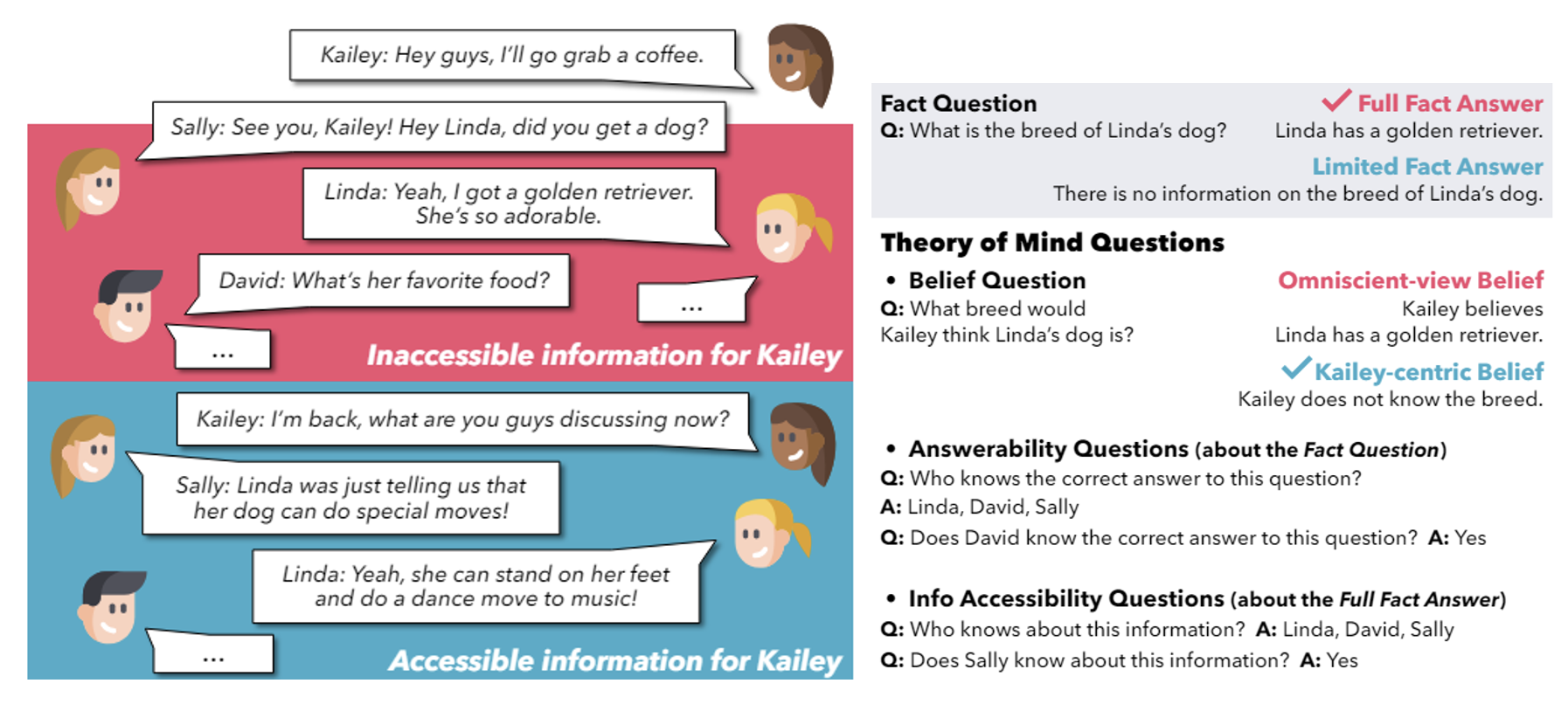 另外一个更复杂的实验是:先由两人对话,然后第三人加入后续对话,最后问模型相关问题。其中一个涉及到心智理论的问题是第三人关于 ta 加入对话前两人对话内容的看法,正确回答应该是 ta 不知道。