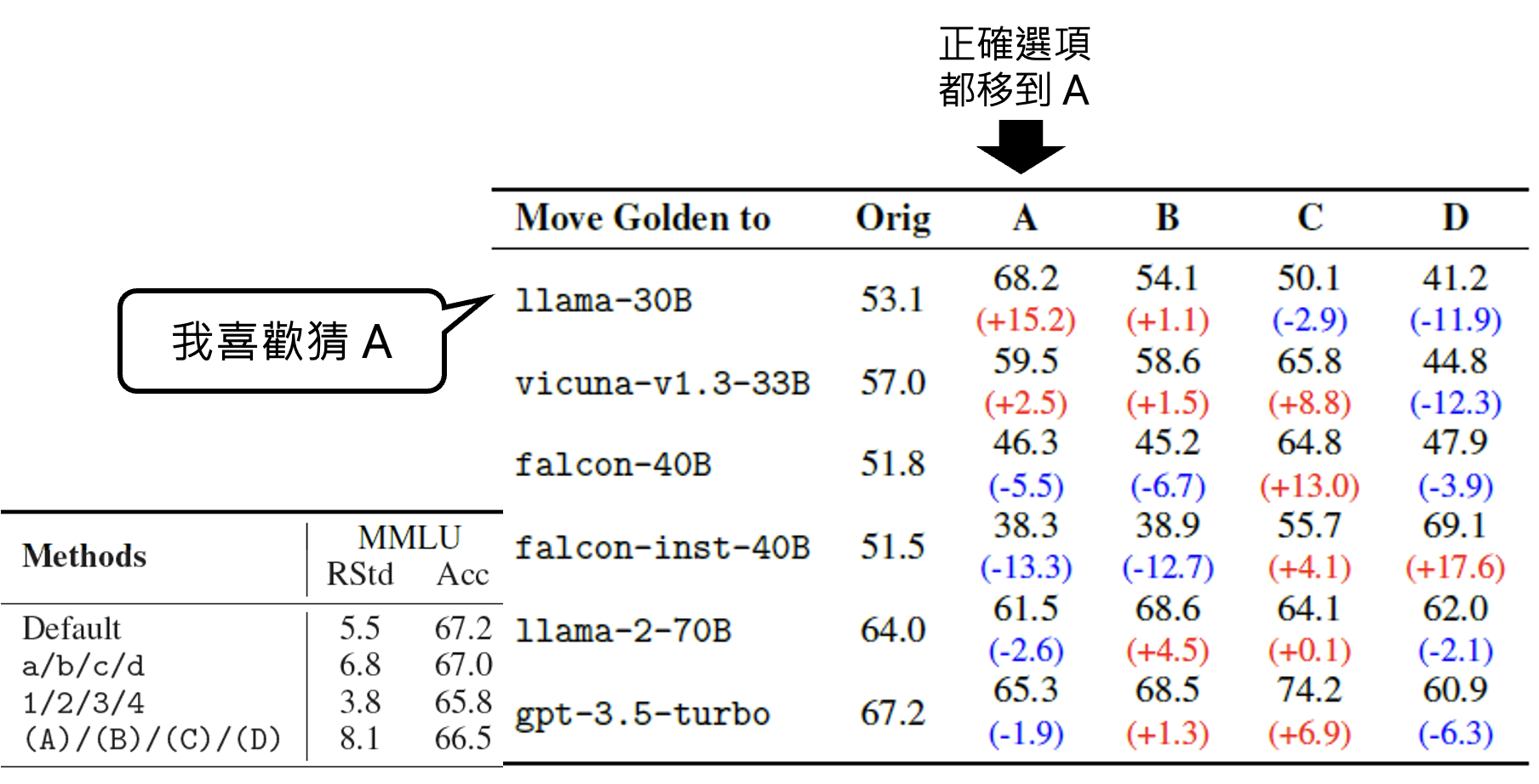 有研究发现,即便改一下选项的位置,模型在所有题目上的正答率也会发生变化(比如有些模型可能就喜欢猜 A 选项
