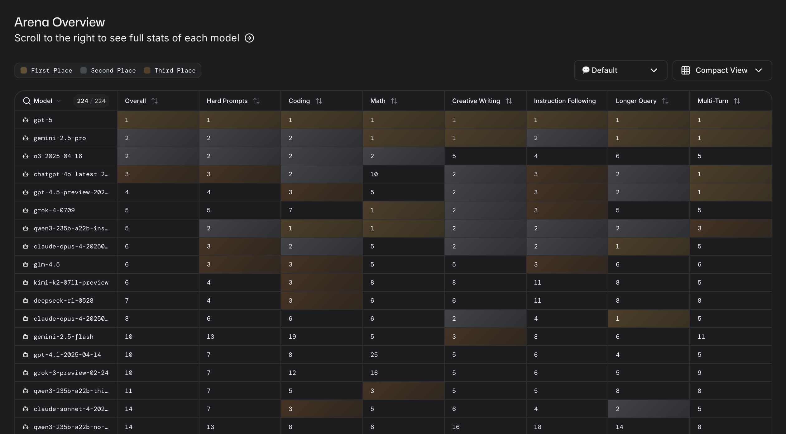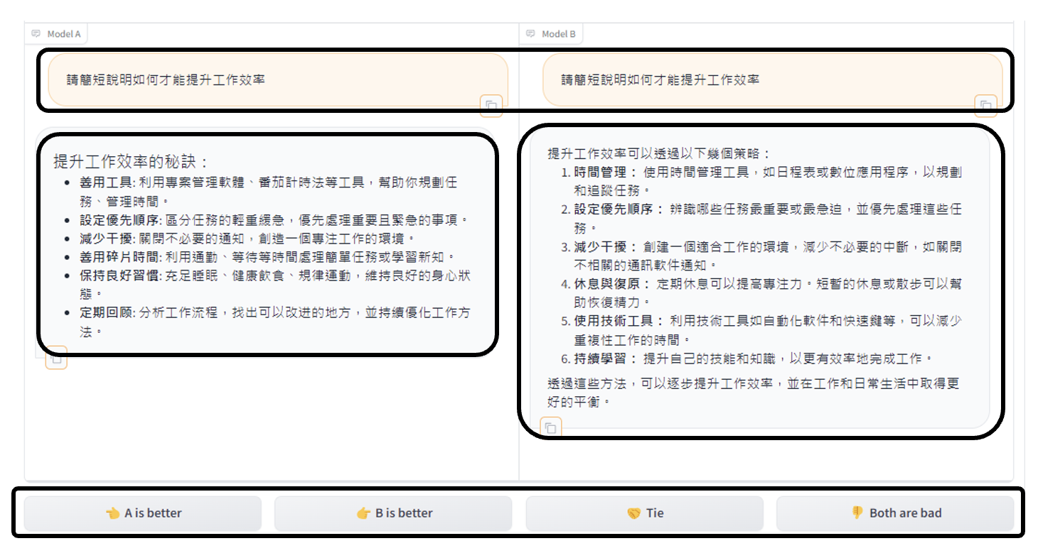 而过去的基准测试集 BLEU,ROUGE 等都是做字面的比对,因此不太可靠。所以或许可以靠我们人类自己来评估模型好坏——有一个叫做 Chatbot Arena(聊天机器人竞技场)的地方为我们提供了一个给模型打分的功能,如下所示: