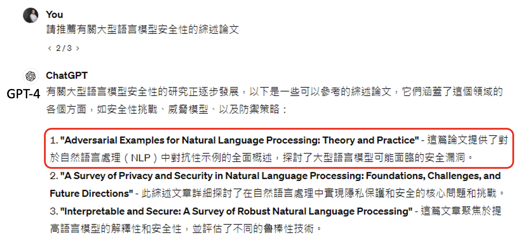 GPT-4 给出一些和本讲主题相关的论文,它确实能给出一些文章名以及简单的描述,但这些文章真的存在吗?Google 上搜了第一篇文章,发现并不存在: