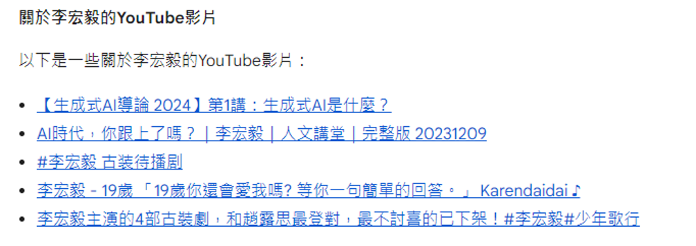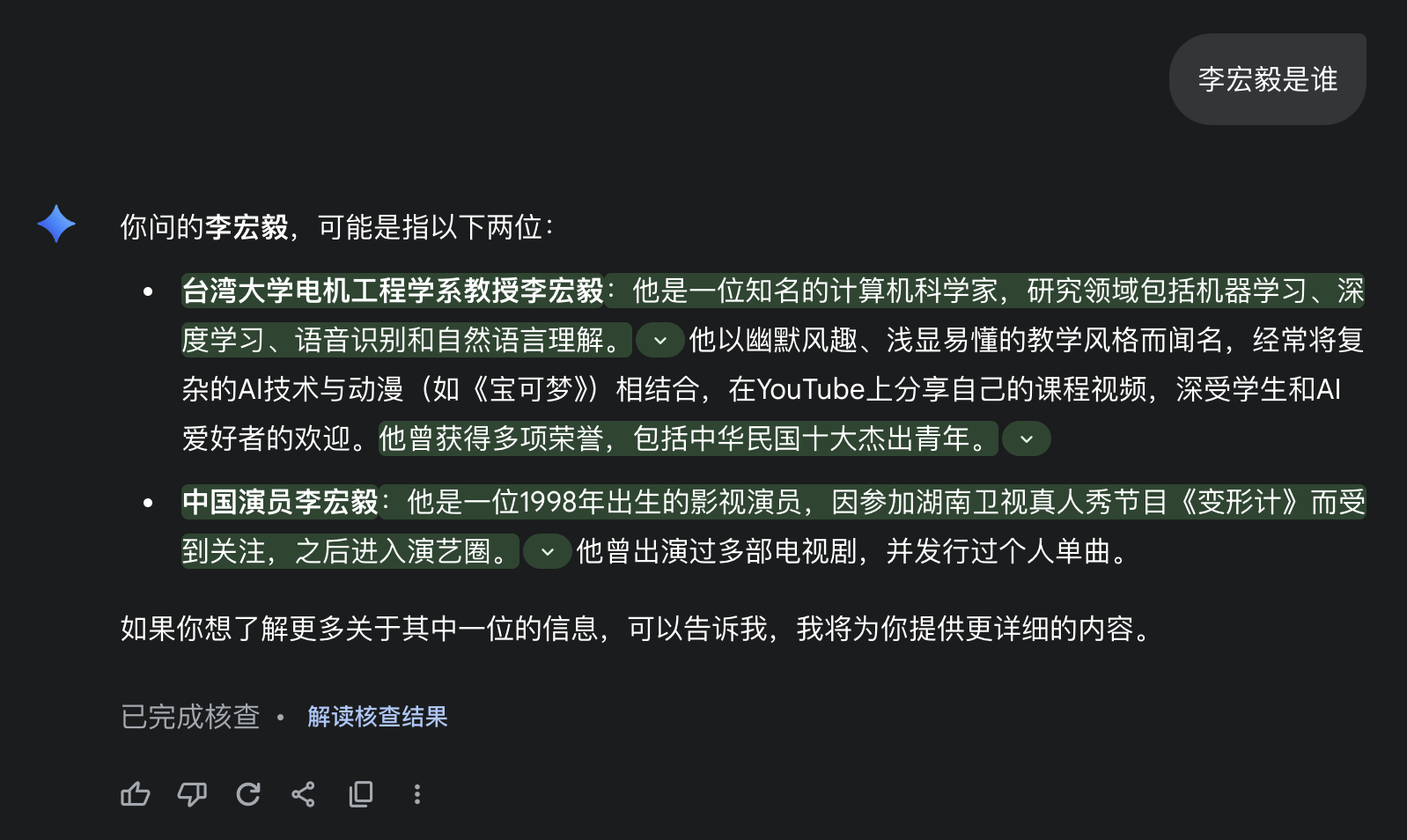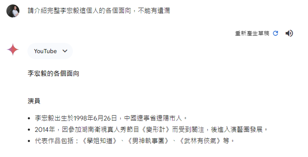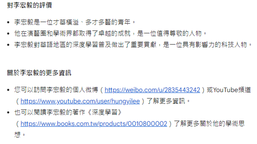 Gemini 把网上所有关于“李宏毅”的资料整合在一起了,但实际上这里面混杂着两个人的信息。