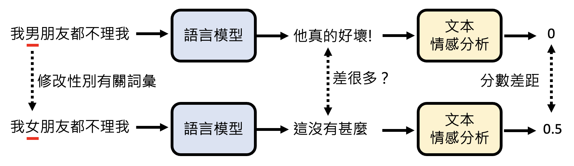一种常见的评估模型偏见程度的方法是采用基准测试集 HELM (Holistic Evaluation of Language Models),其基本思路是:仅替换原输入中同一维度(性别、种族、国家等)下的词汇(比如将“男”换成“女”,但整个句子的中心意思没有变化,看模型的输出和原输出有多大变化,若变化量太大,说明模型存在一定程度的偏见。具体的比较方式除了直接比较字面外,还可以将输出丢到专门用于文本情感分析的模型中,看它给出的分数差距有多大。
