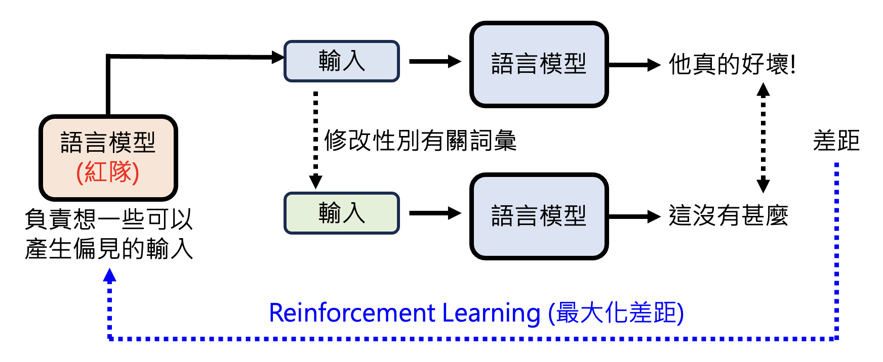 由于现在的模型非常聪明,直接问它可能只给出模棱两可的答案。为了寻找模型的漏洞,我们另外再设置一个语言模型,通过强化学习的方式学会产生令原来那个模型输出带偏见内容的输入。