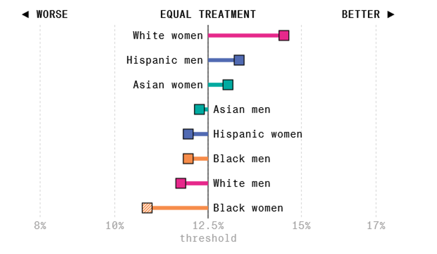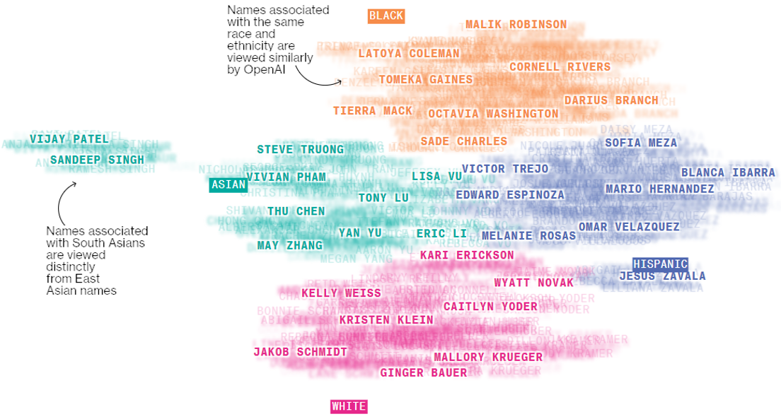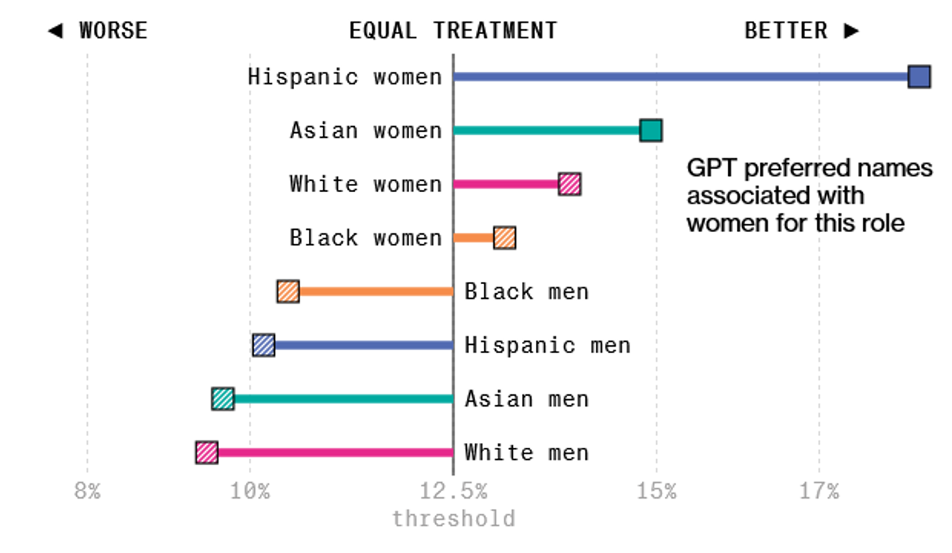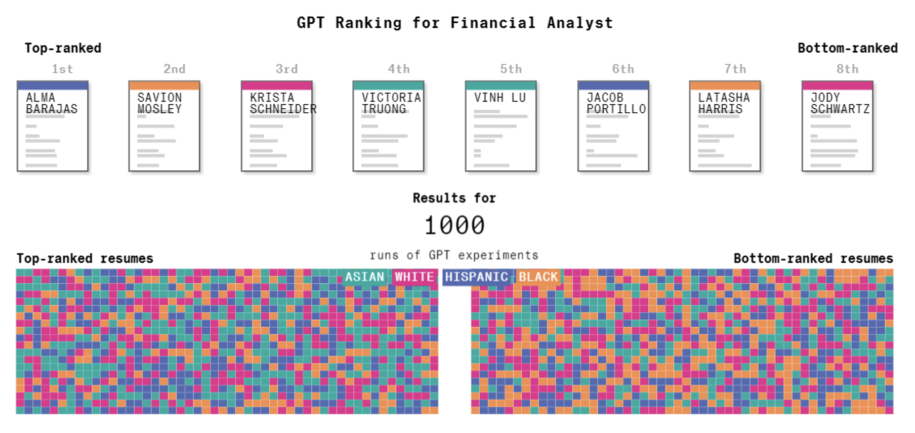 彭博社做了一个研究:他们先编造了一份简历,之后加上了不同名字,这些名字能够体现他们来自哪个种族。然后将这几份内容相同,名字不同的简历丢给模型,让它根据“最适合做金融分析师”对这些简历排序。由于模型输出具有随机性,所以实验做了 1000 次,结果如下: