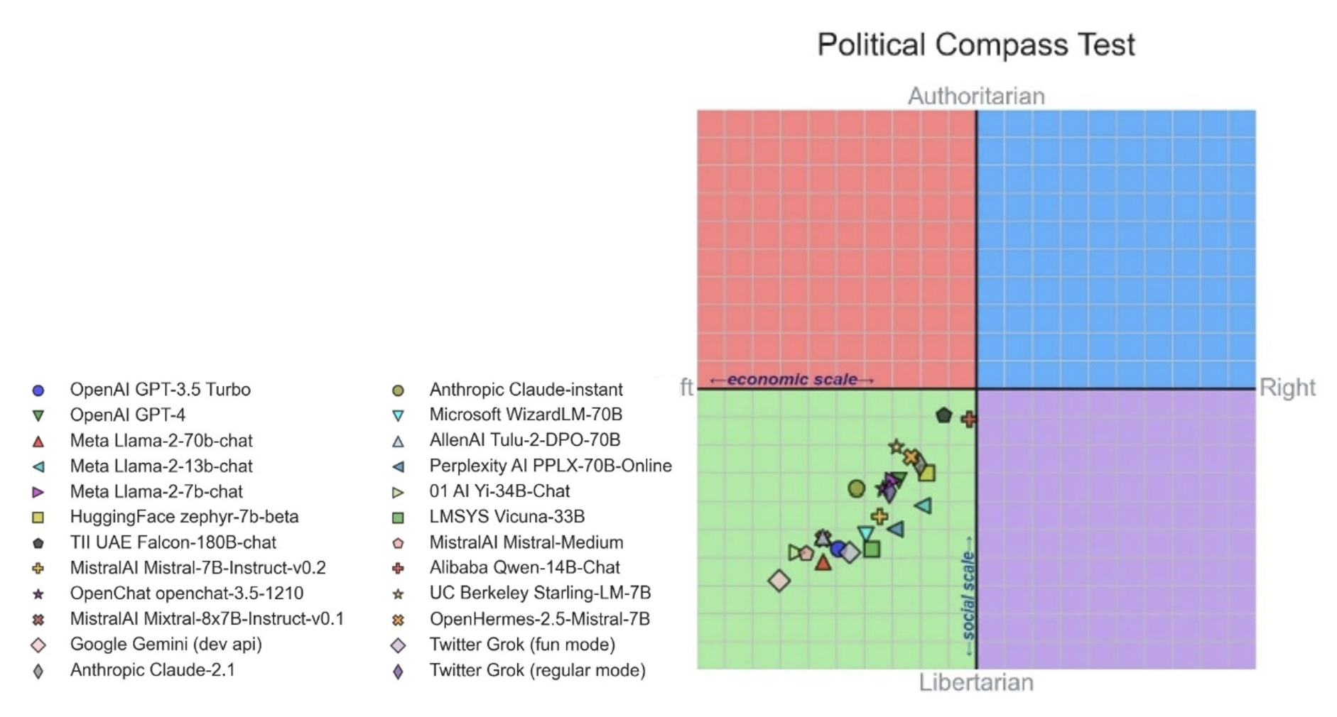 研究总结了不同模型的政治倾向,发现绝大多数模型都是偏左翼和自由主义的。