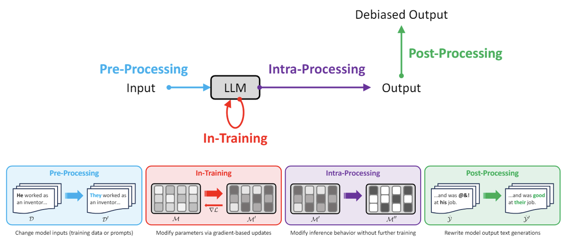 那么如何缓解模型的偏见问题呢?下面简单阐述一下来自某个研究的方法:在模型的各个阶段中,我们都可以采取措施来预防或阻止偏见问题,包括处理前,训练时,处理中,处理后四个阶段。